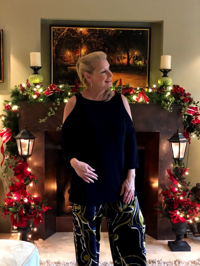 I love these palazzo pants and the navy cold shoulder top I purchased 2 years ago. I have always worn the chartreuse jacket with my palazzo pants but this year I am wearing the navy cold shoulder top.