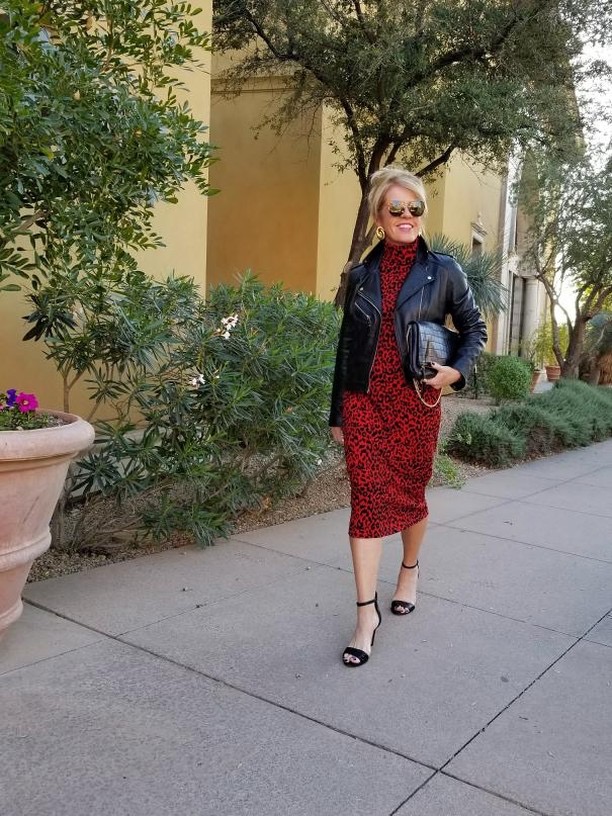 Karen from AboveandBeBlonde is wearing a red leopard print dress that will look fabulous for the holiday season!