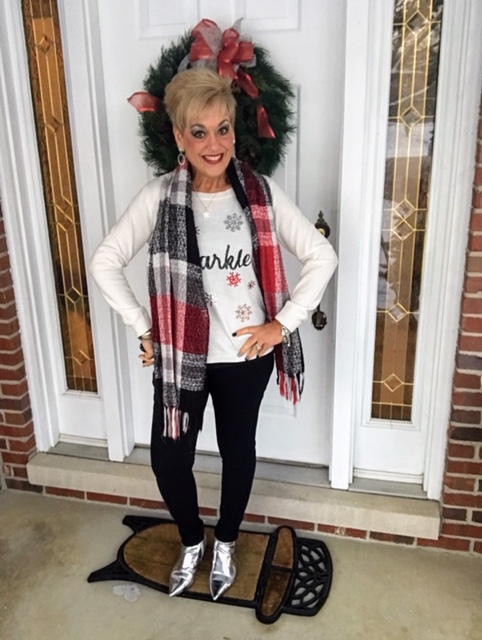 Julie from FashionTrendsandFriends wears a funĀ holiday sweater with her plaid scarf and silver boots to get her merry on!