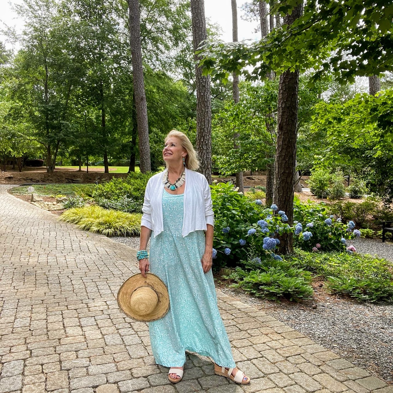 For those of you who like to wear an extra layer over your maxi dress in the summer, you have so many options. I am wearing a cotton cropped jacket that I purchased 6 years ago. I wear it over sleeveless dresses when I am flying or having dinner out with my husband. You can easily wear white cotton or a gauzy linen shirt as an extra layer. I love wearing my white denim jacket over dresses in the summer.