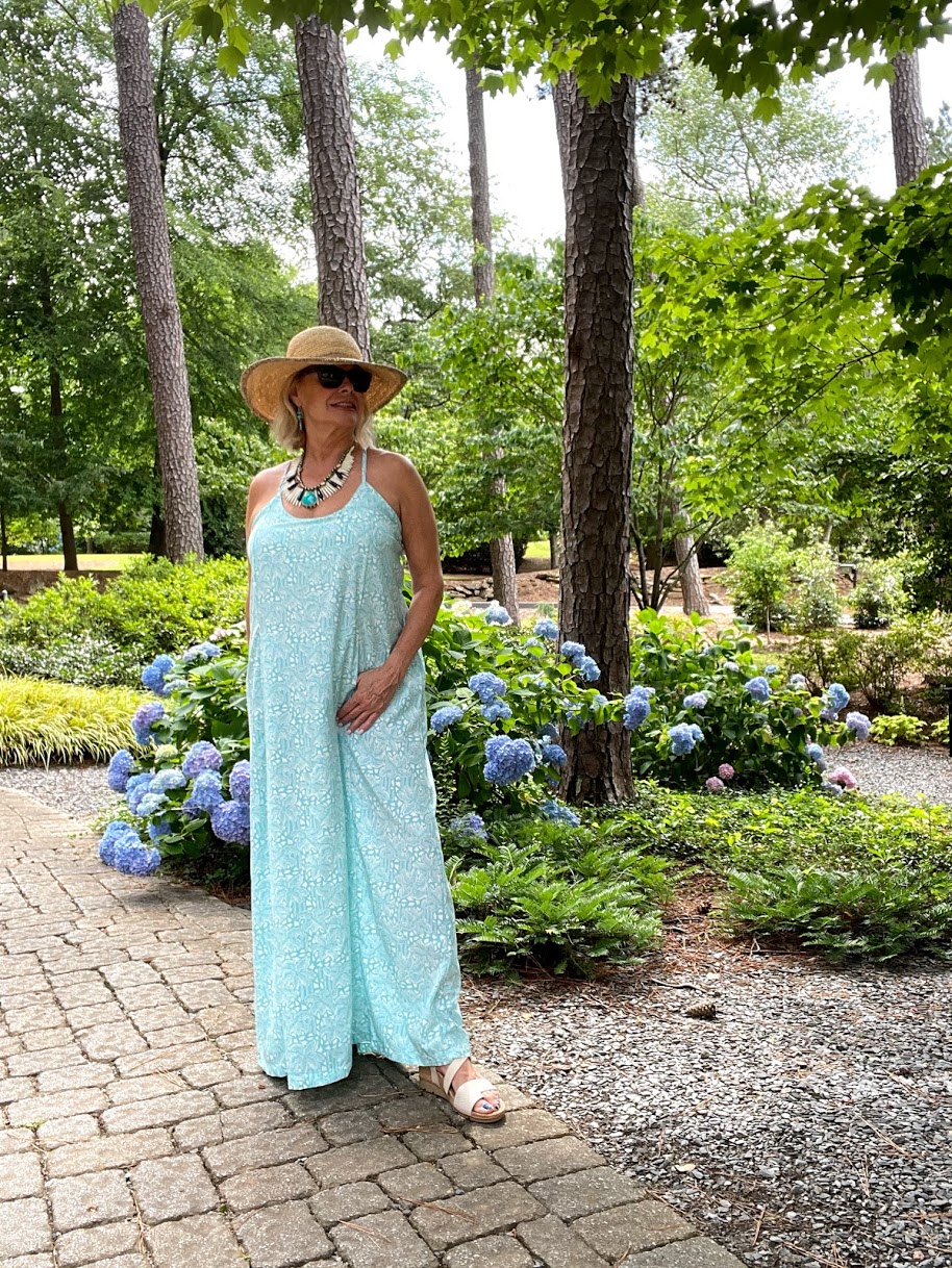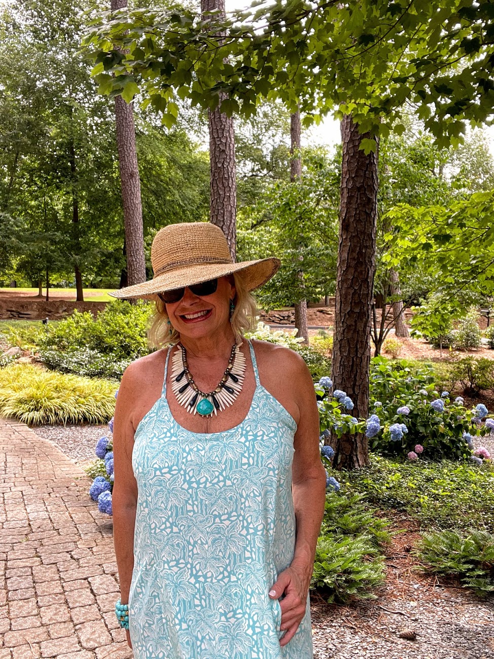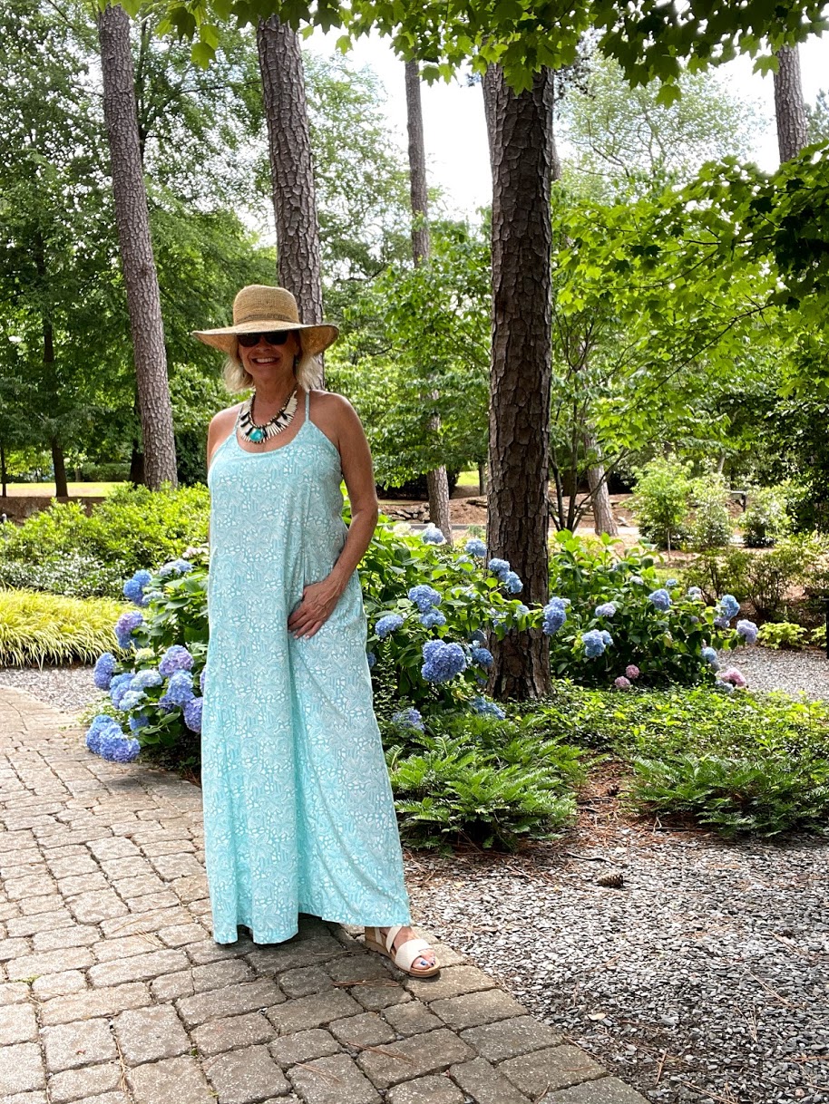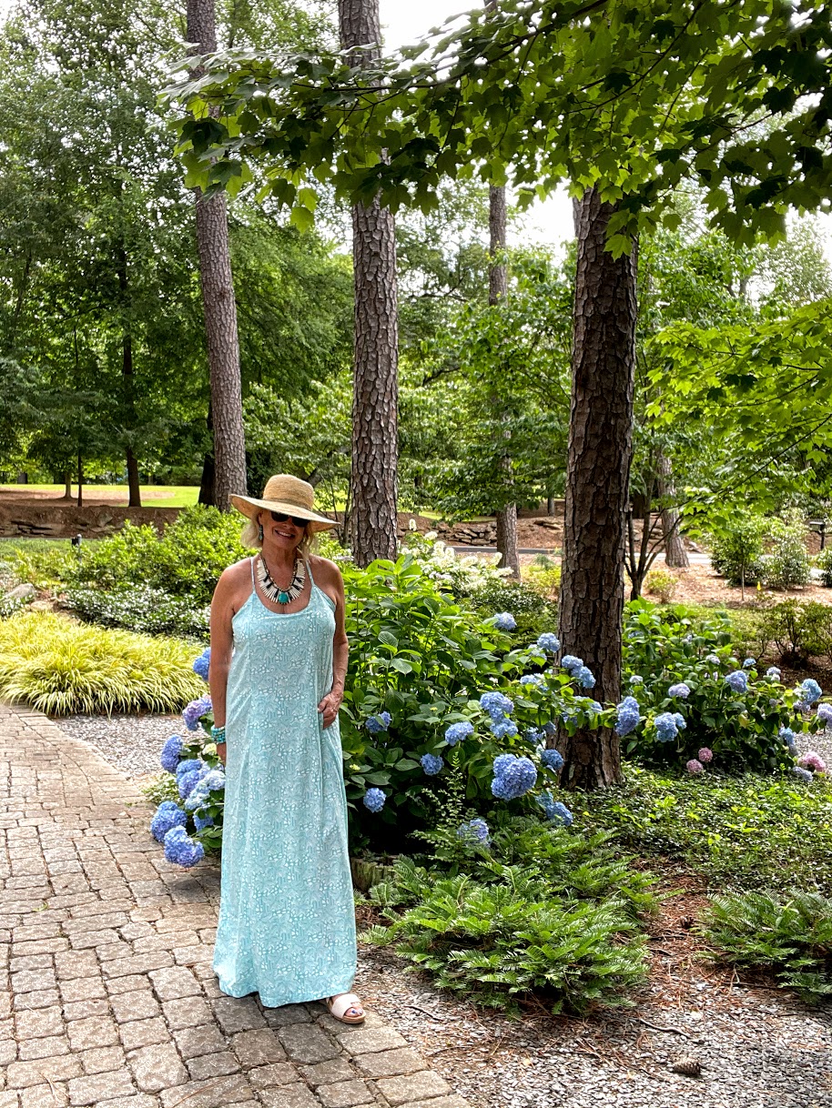 Summer maxi dresses always look wonderful with summer straw hats. Wearing a large brim summer hat protects our faces from the sun but it’s also a wonderful accessory. My straw hat is over 5 years old but I am adding some great straw hats that would go perfect with this summer dress.