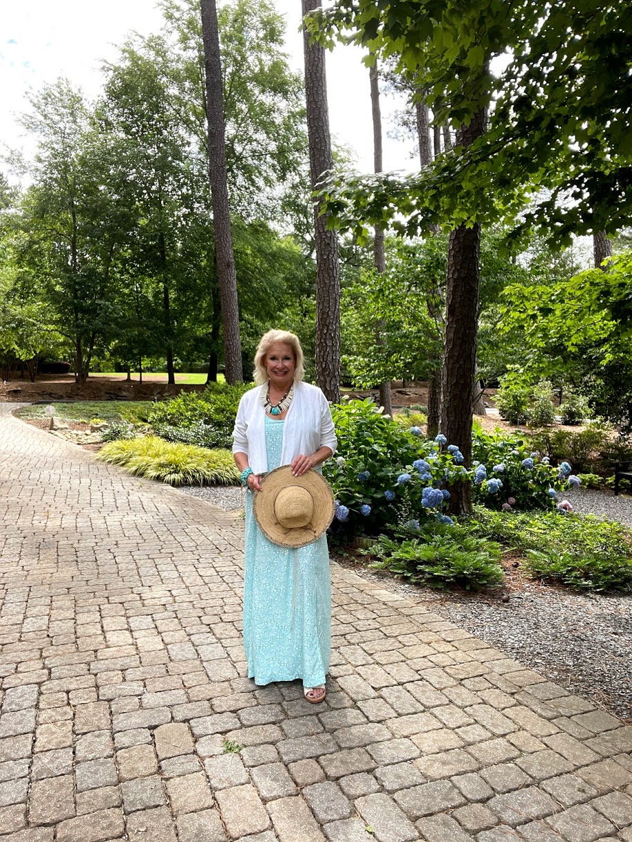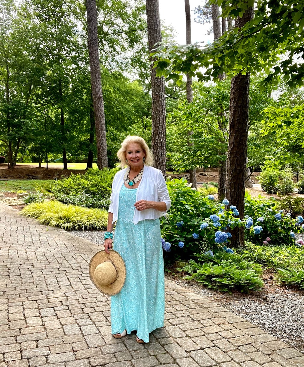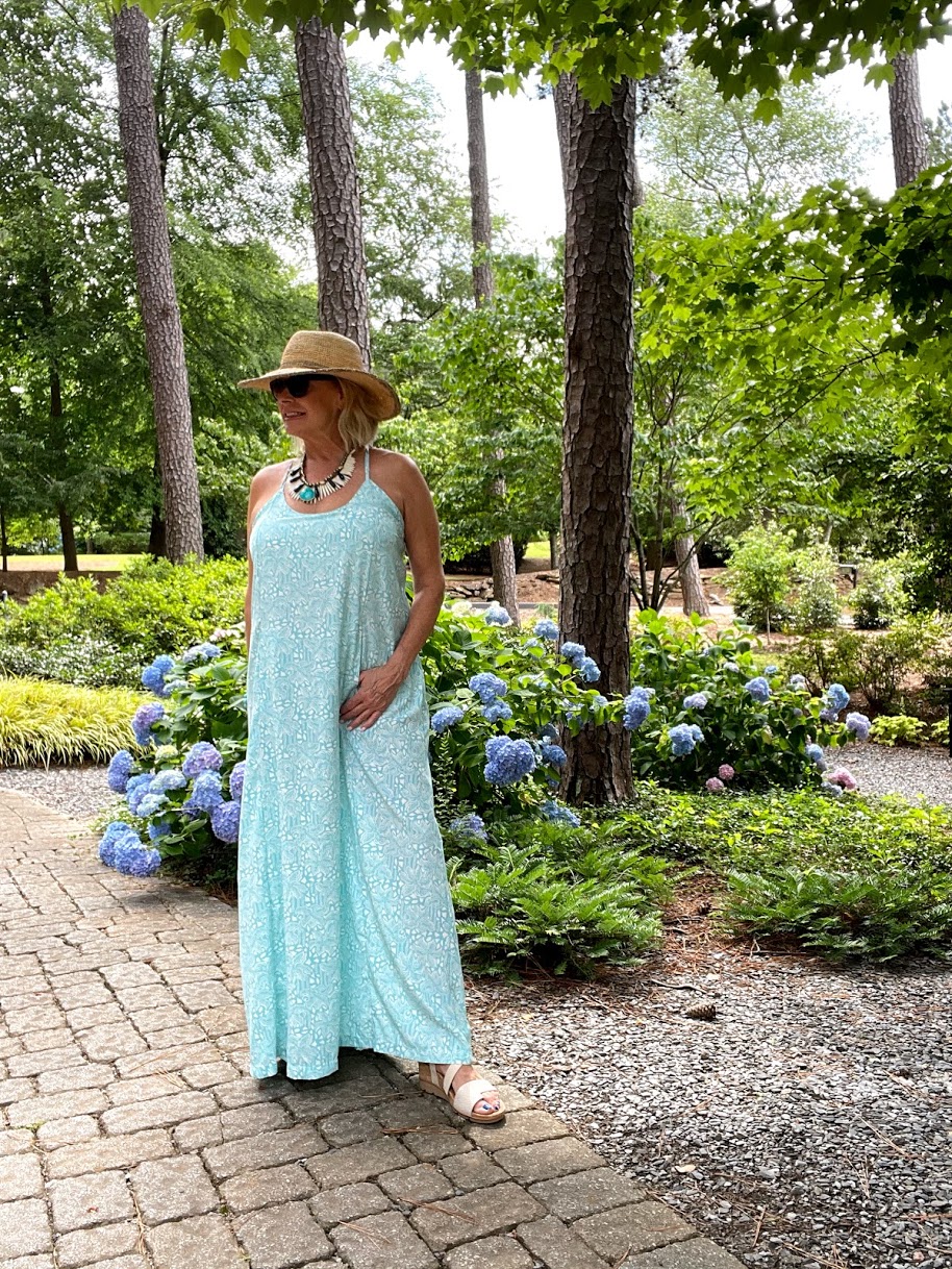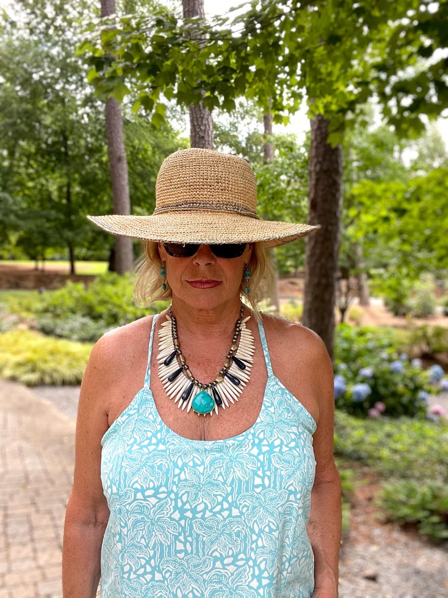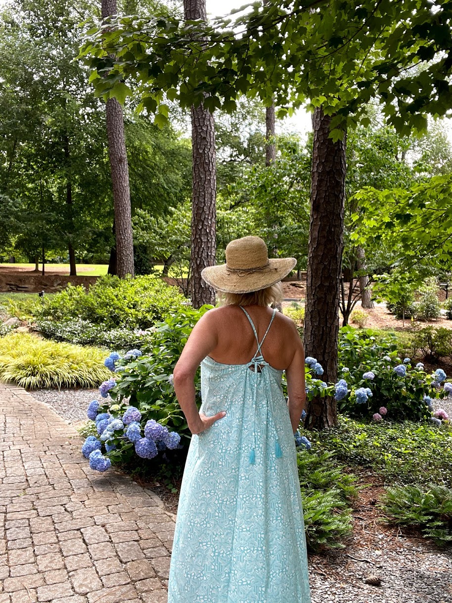 Summer maxi dresses always look wonderful with summer straw hats. Wearing a large brim summer hat protects our faces from the sun but it’s also a wonderful accessory. My straw hat is over 5 years old but I am adding some great straw hats that would go perfect with this summer dress.