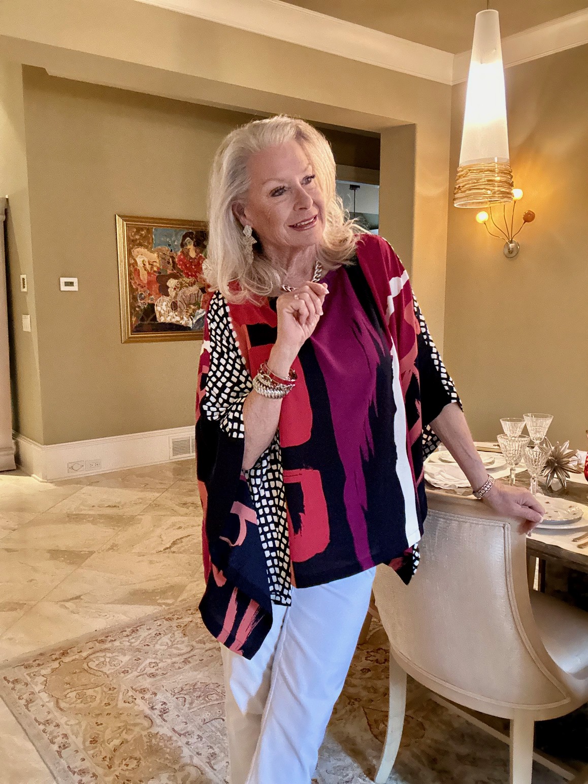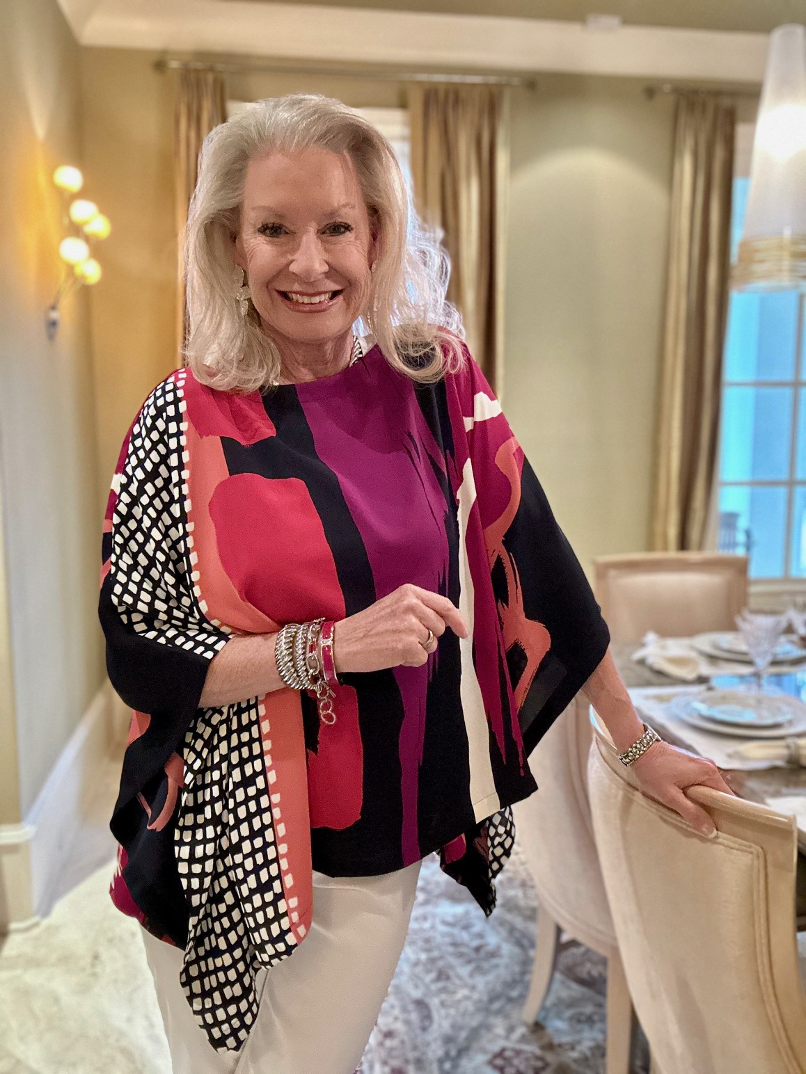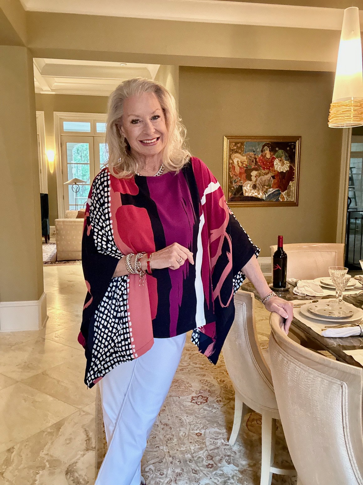 How pretty is this Abstract Print Poncho from Chico’s? This multi-colored poncho can be dressed up or down with jeans or leggings on casual days or with pants for more upscale affairs. I am wearing Chico’s SO SLIMMING 360 Brigitte Basic Slit Ankle Pants in alabaster white to finish my outfit.