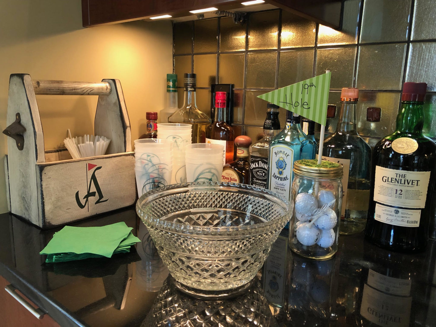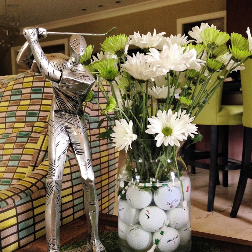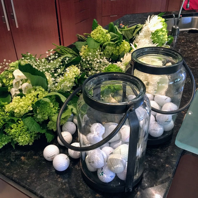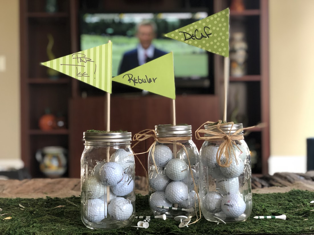 If you’re a golfer, this is the easiest party decor to put out. I use old golf balls in my flower arrangements and my mason jars, but you can use new ones. We have a basket full of them from when my husband was fishing them out of the club’s ponds for me to use.