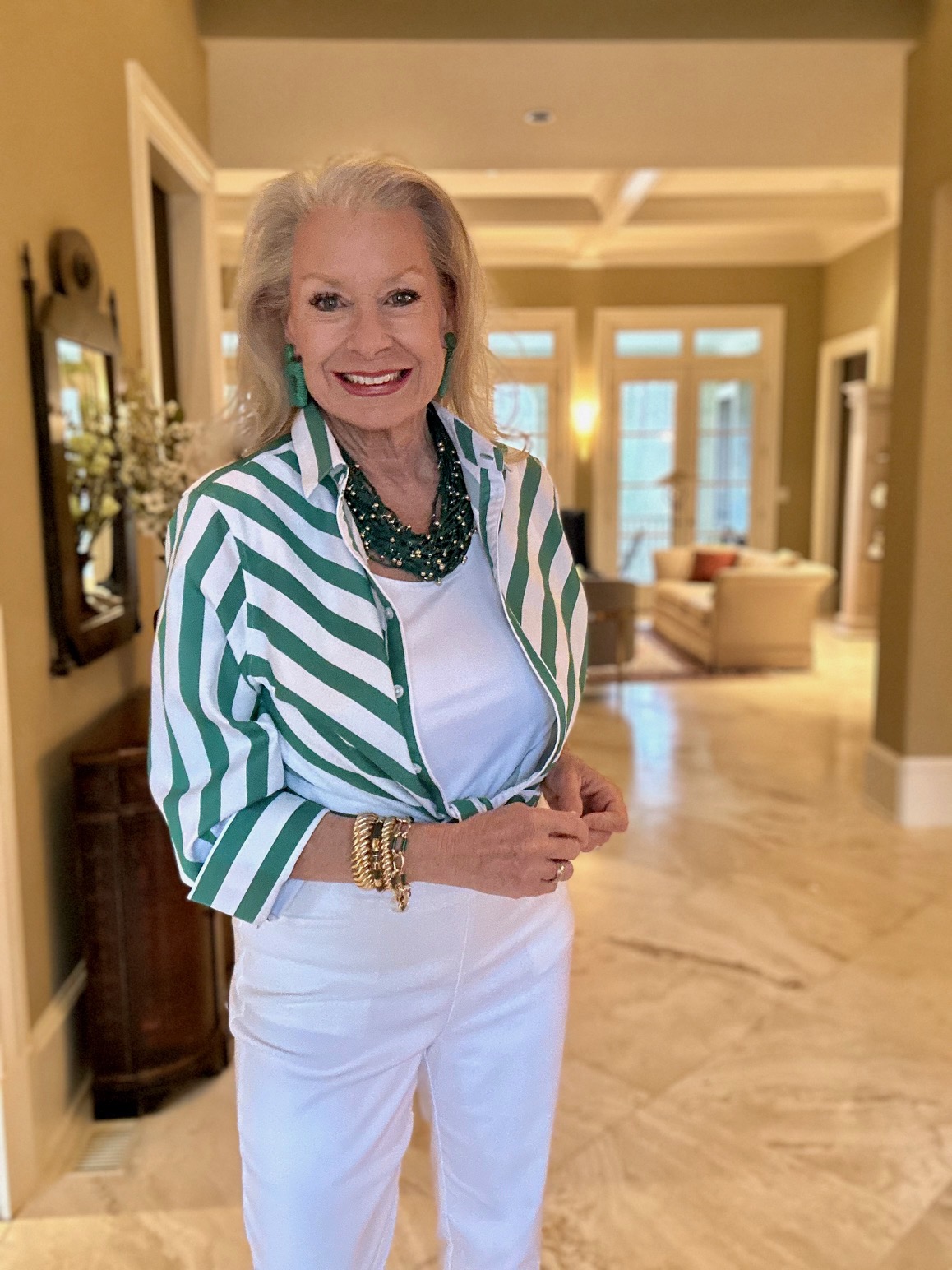 I will be wearing clothes that you saw me wearing on my trip to Saint Augustine. I love this no-iron shirt with the white tank and the white pants from Chico’s.