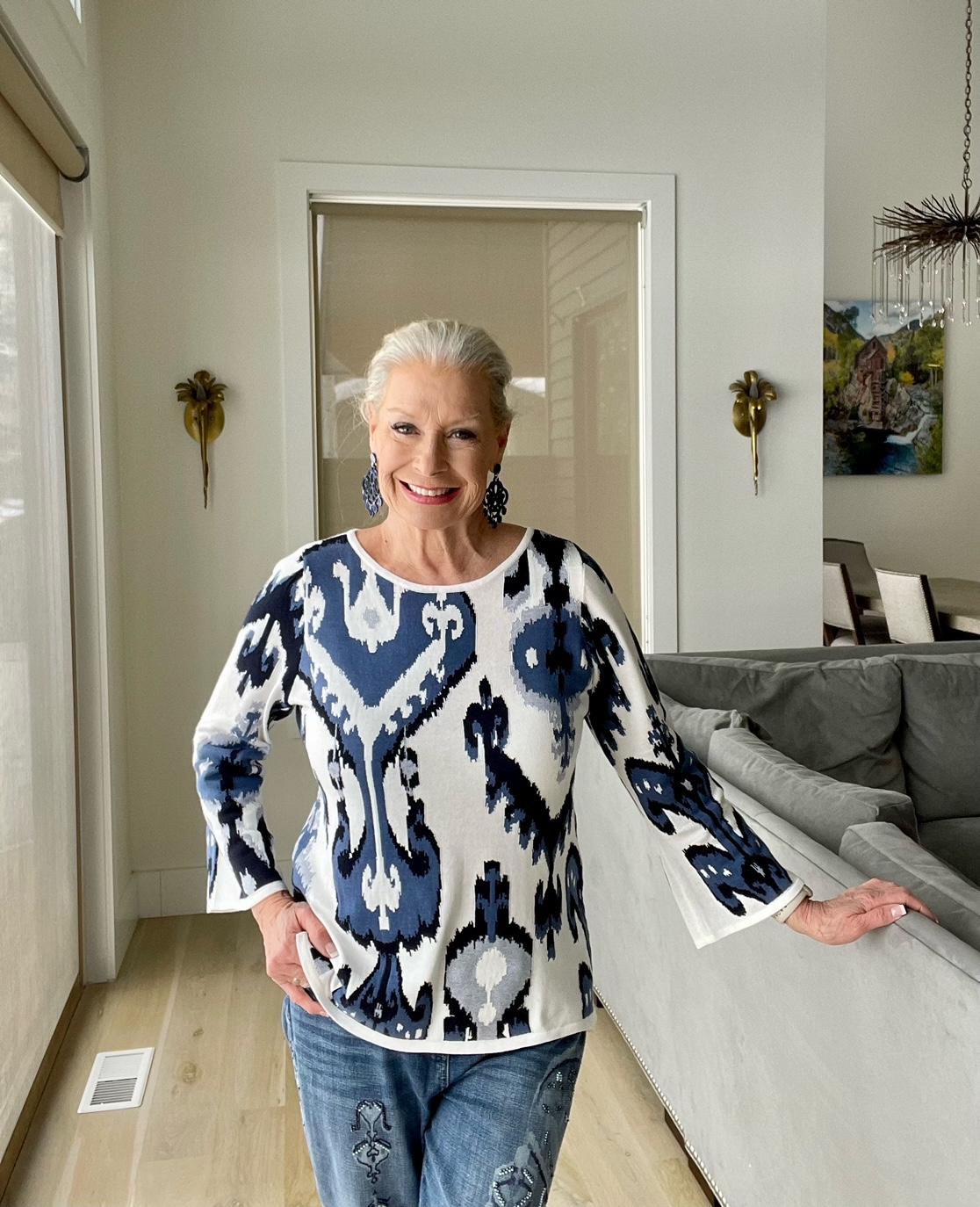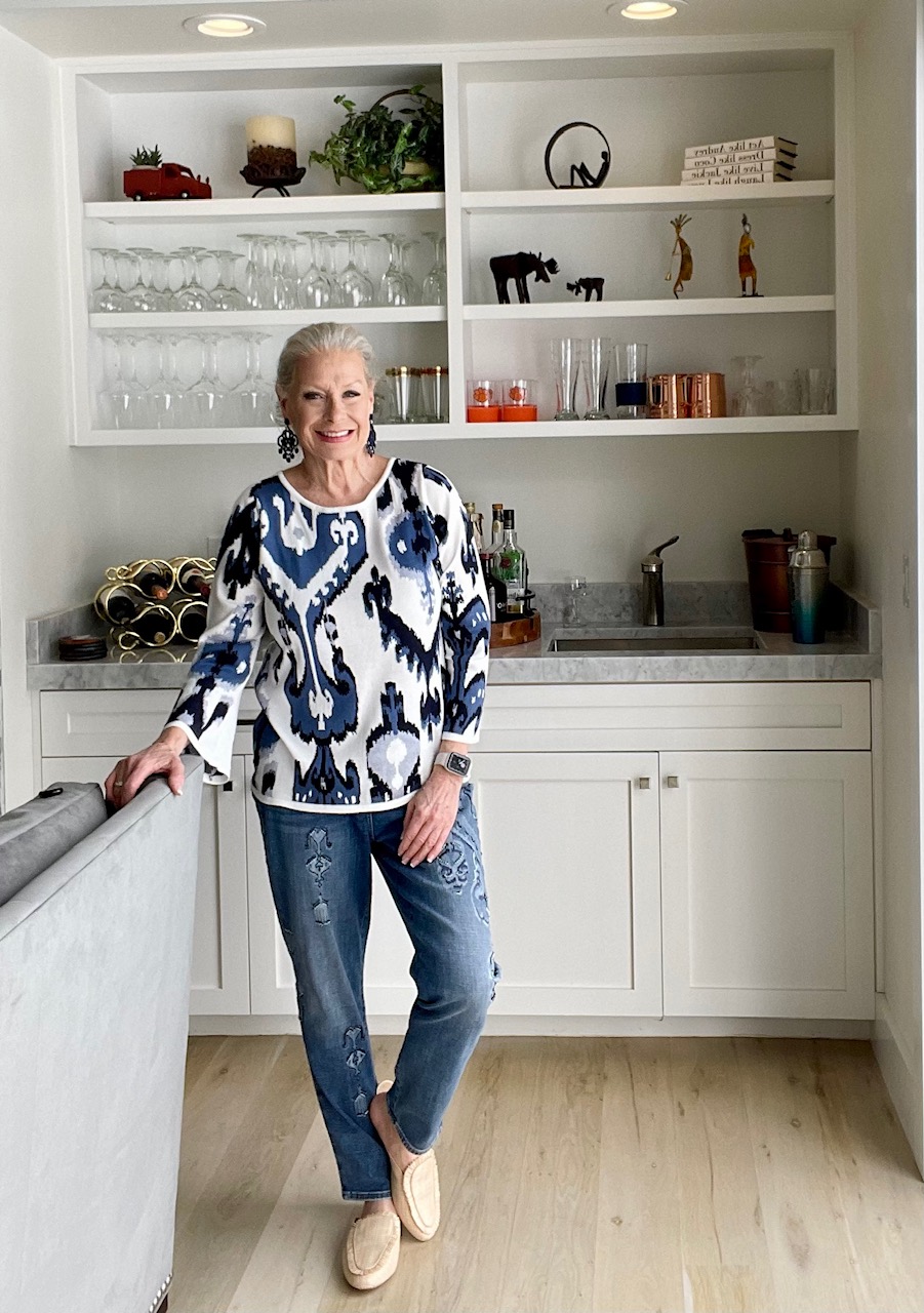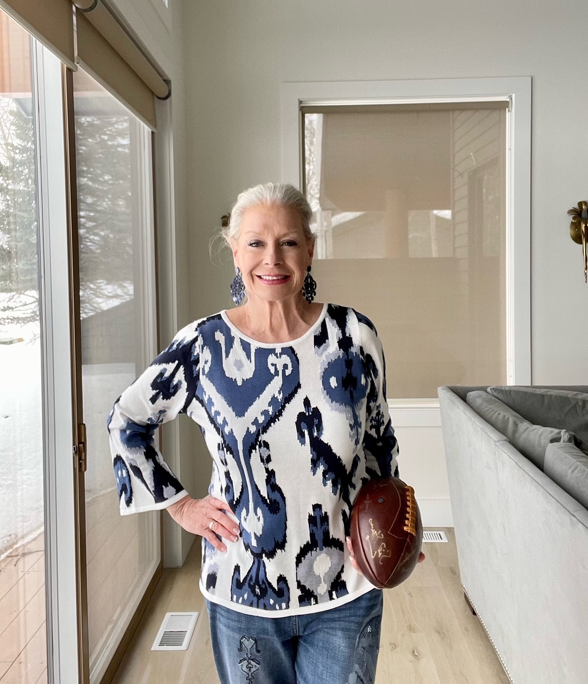 Nothing can be more comfortable to wear for a Super Bowl party than a pair of jeans and a sweater. Chico’s has graciously given me this outfit to share with you. I am so fortunate to work with brands like Chico’s I know many of you enjoy shopping at. This Ikat Print Intarsia Pullover Sweater is a classic navy and white that looks great with white jeans or these Girlfriend Laser Ikat Ankle Jeans that are part of Chico’s new spring arrivals. Your favorite So Slimming® design gets a style enhancement with the embellished Girlfriend Laser Ikat Ankle Jeans.