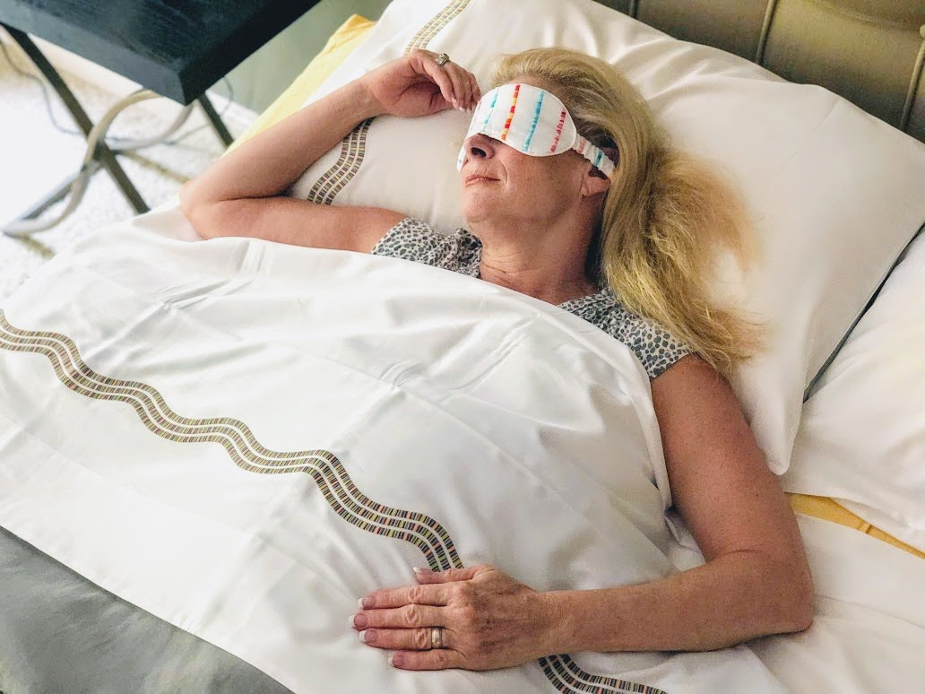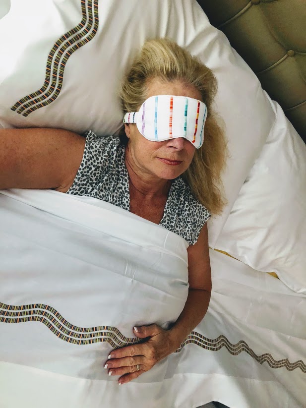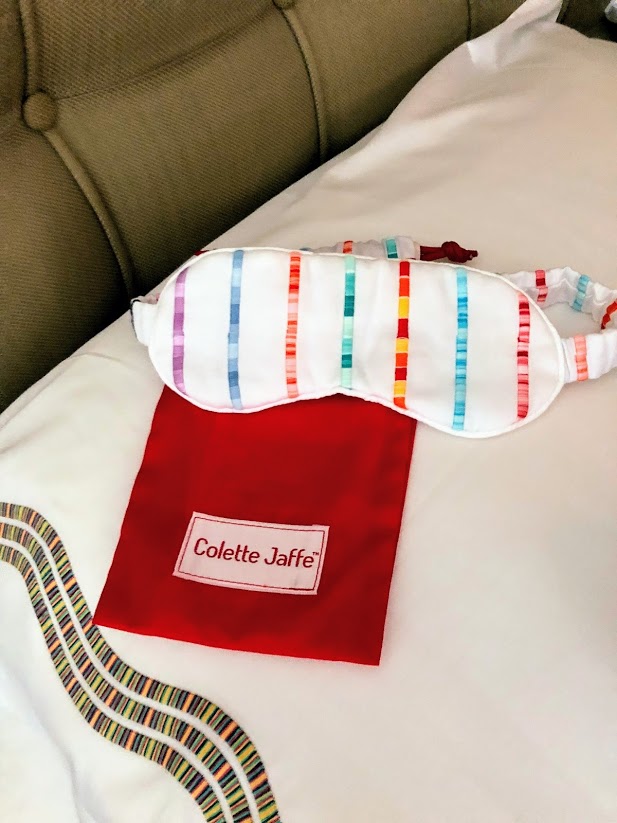 I am using the Multi Righe Sleep Mask made of Egyptian cotton sateen, filled with plush, washable fiberfill and finished with a covered elastic strap. All this softness will help you nap or sleep wherever you are. Perfect for travel when you’re on an evening international flight when crossing many time zones!