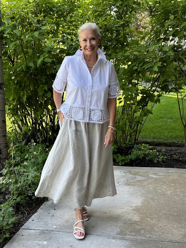 Wearing the Poplin Crochet Top with Linen Embroidered Scallop Hem Skirt.