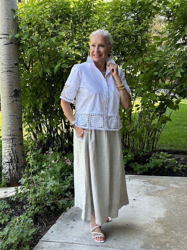 I paired the crochet top with Chico’s Linen Embroidered Scallop Hem Skirt for an outfit that you can wear out for dinner or to a summer party. The linen skirt is designed with an easy pull-on smocked elastic waistband that provides a flattering fit, no matter where it sits on your midsection, plus an intricately embroidered scallop hem. I have a lot of Chico’s linen clothes and enjoy wearing them all! They wash really well too!