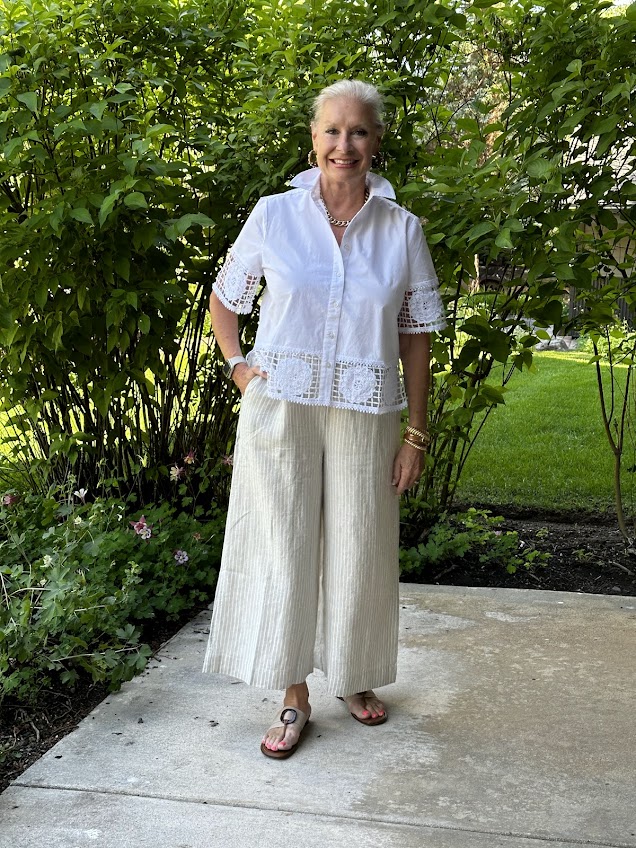 Or, for a more casual look, I’m wearing the top with Chico’s Linen Stripe Culotte Pants. I now have 4 pairs of linen culotte pants. You saw the white ones that I wore on our family Saint Augustine Beach Trip.