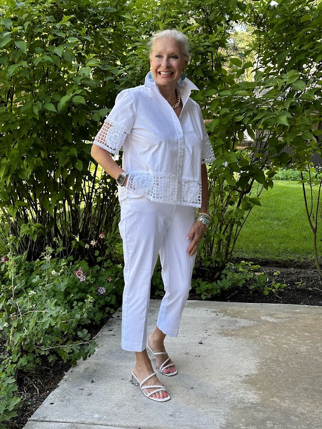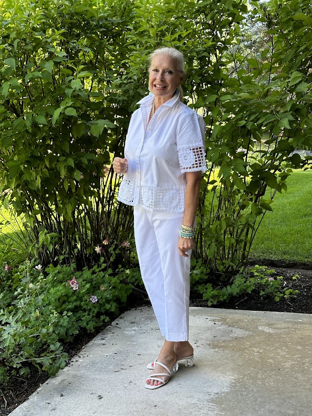 You can’t go wrong with an all-white look for Summer. It’s been a scorcher this summer, and wearing white is the best color to keep cool. This time, I’m wearing the crochet top with Chico’s Brigitte Slim Ankle Pants. These pants are my favorite and come in so many colors and prints. You can also wear the top with Chico’s Brigitte Slim Cropped Pants.