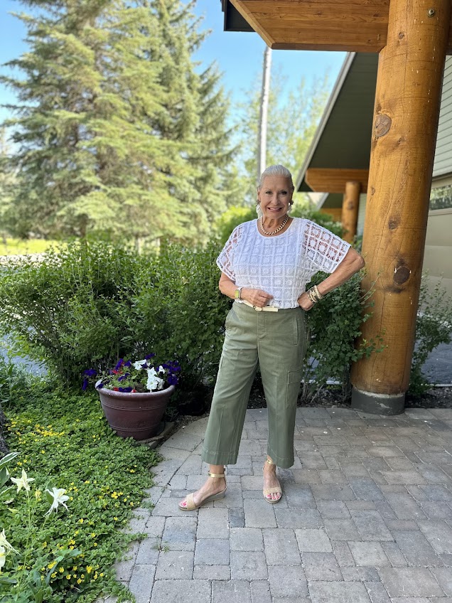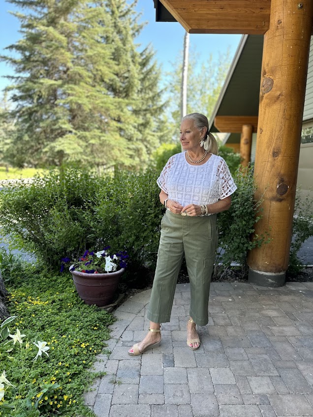 Here’s another pair of Chico’s pants that have been selling very well since I first debuted on Instagram. Most of my clothes first appear on Instagram, and then I write a post about them. The Cargo Wide Leg Cropped Pants have been a real surprise to me because I REALLY LIKE them! Cargo pants are popular again, and I’m so glad they’re back! Designed with trademark cargo pockets, these wide-leg crops feature an easy ribbed pull-on waistband and fashion-forward wide hem. These pants are perfect for everyday trendsetting. As you can see, I belted the pants to wear with the crochet top.