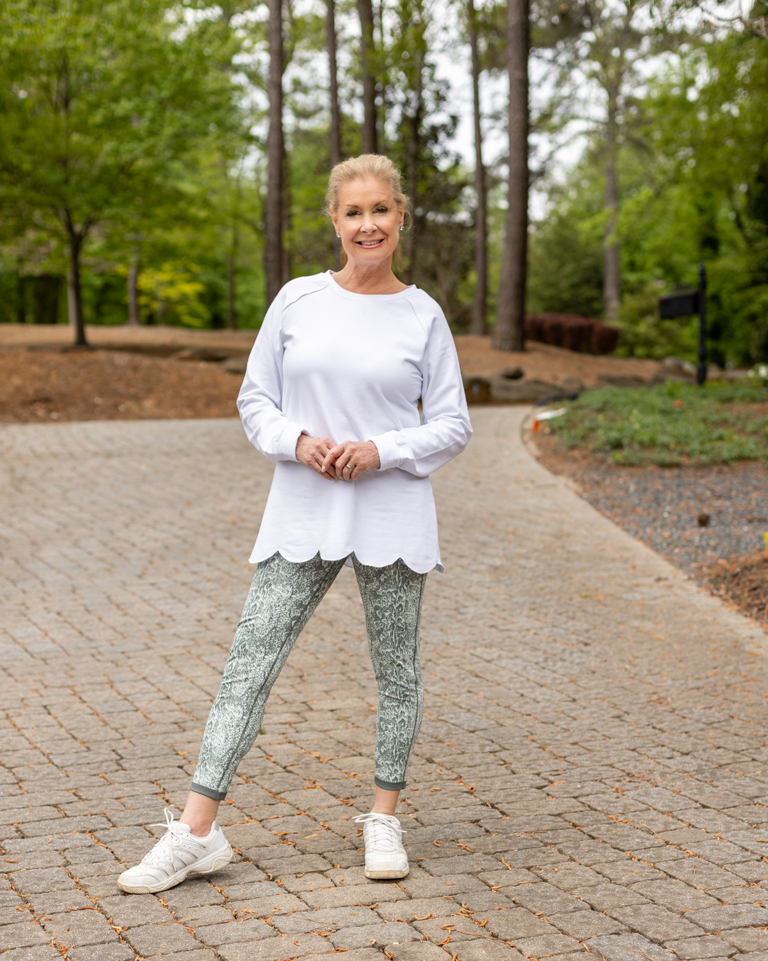 This scalloped edge pullover is my favorite sweatshirt to wear with jeans or when I workout. I am wearing the sweatshirt over these reversible garden snake print leggings. Both are on sale now!