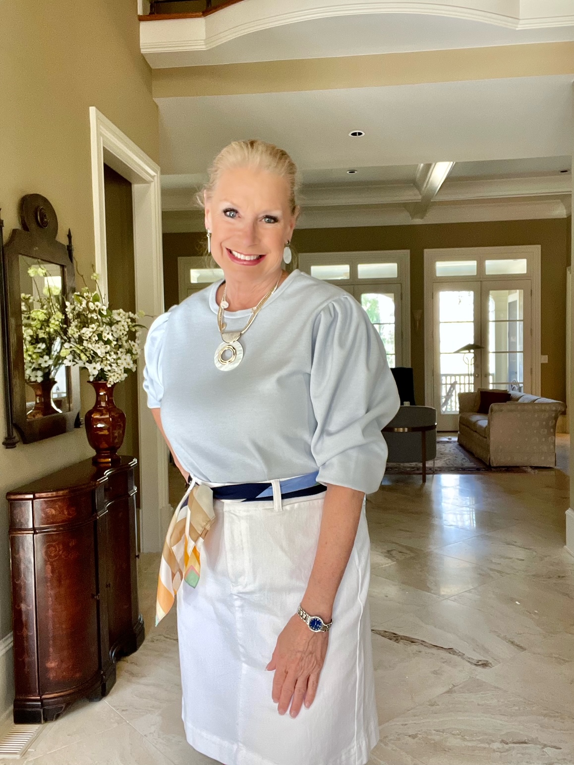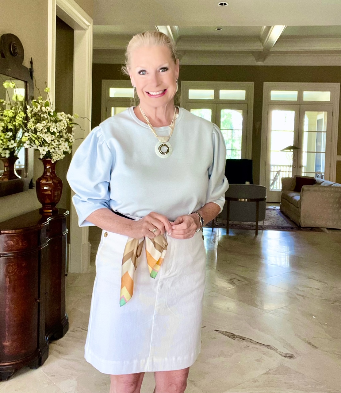 There is nothing better to wear in the spring than a lovely skirt and top. You can easily tuck in your sweatshirt in your favorite skirt. I love this white denim skirt because it’s a workhorse in my wardrobe. I tucked in my pullover and made the puff sleeves three-quarter length. This baby blue top has pleated puff sleeves, which I love. Unfortunately, I should have sized down because it runs large.