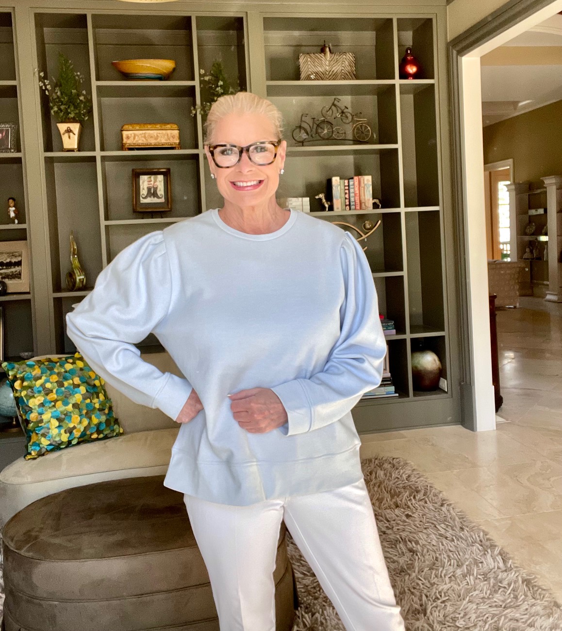 3. I love the color and the puffed sleeves on your sweatshirt! You have styled it so many ways perfectly. And don’ts you just love the comfort and ease of care that comes with wearing a sweatshirt over a sweater? I love the washability factor.