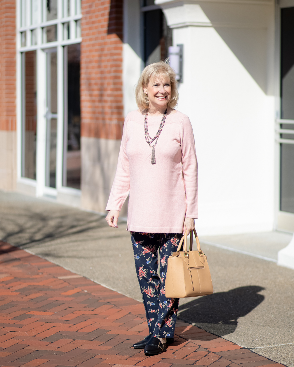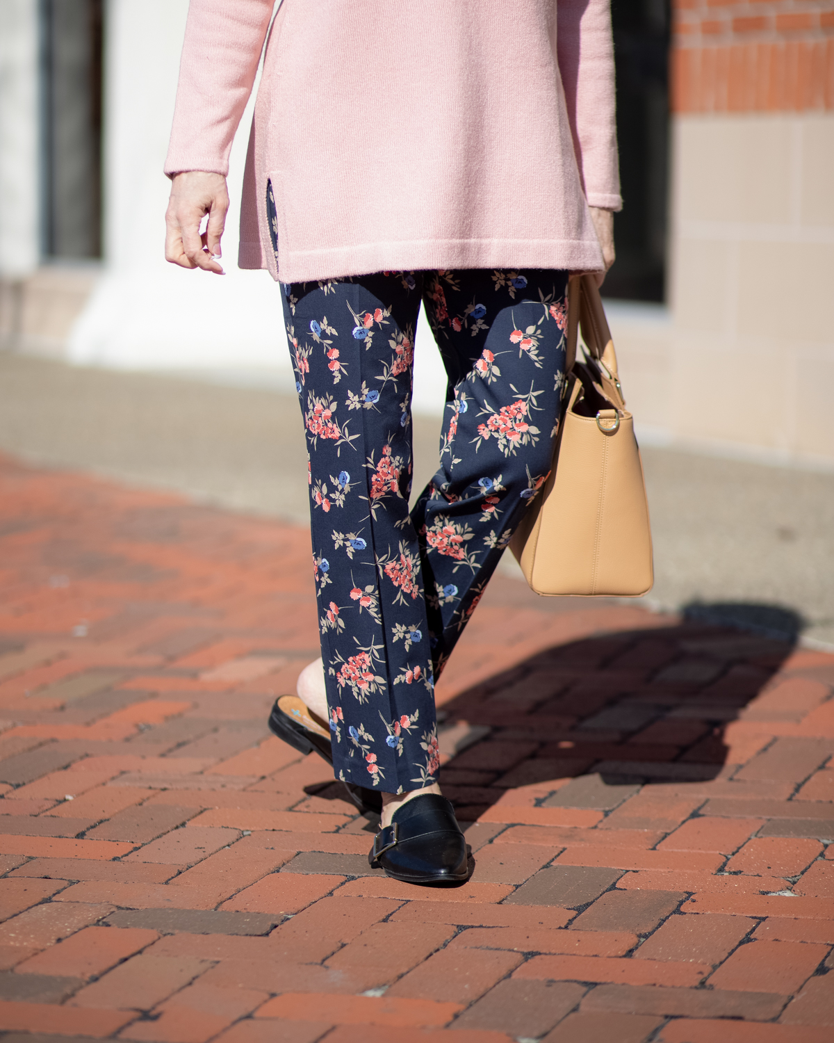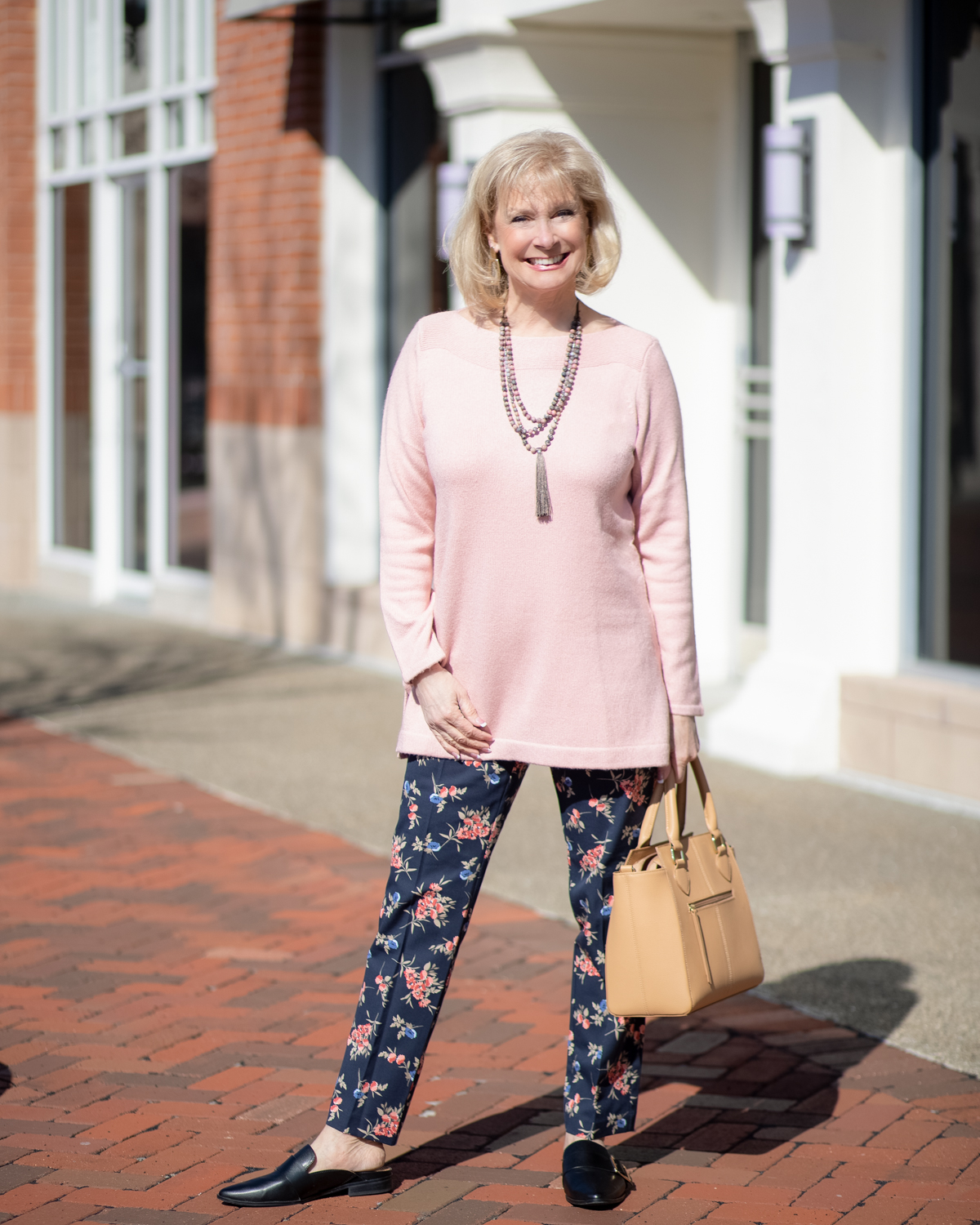 Love that sweater! I’ve always loved a blush pink and it really looks great with the navy. The pants are adorable and great for Spring too. Looking fabulous!
