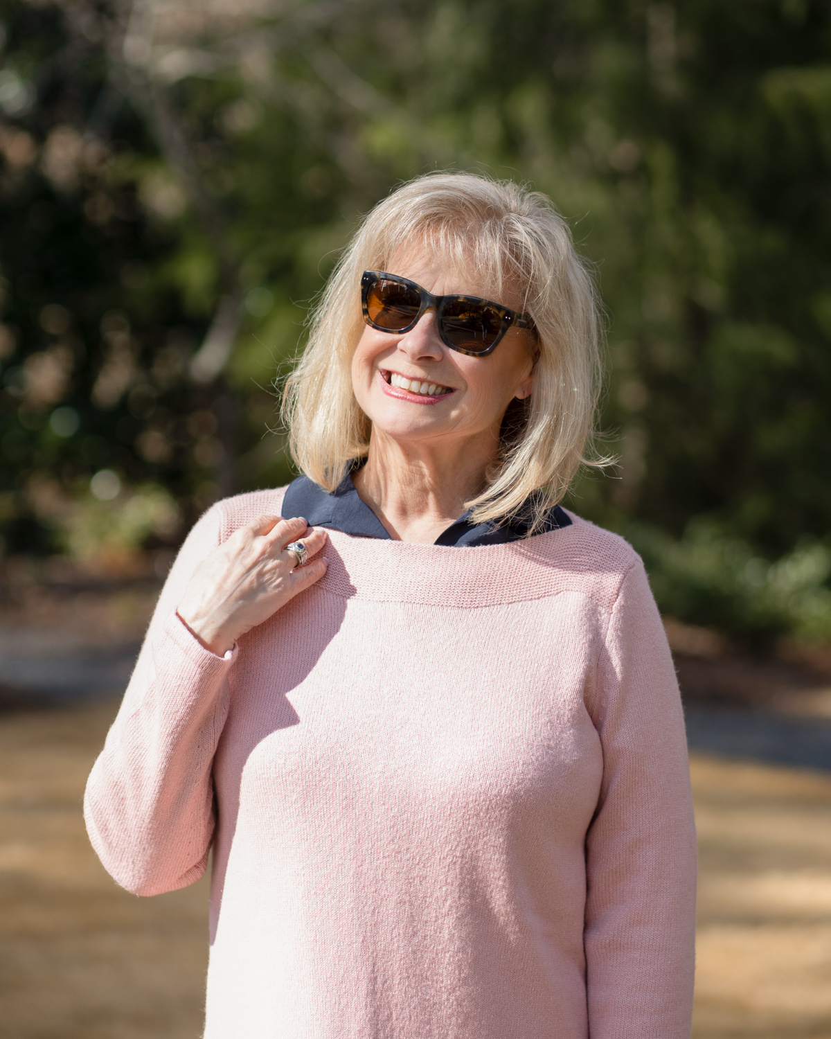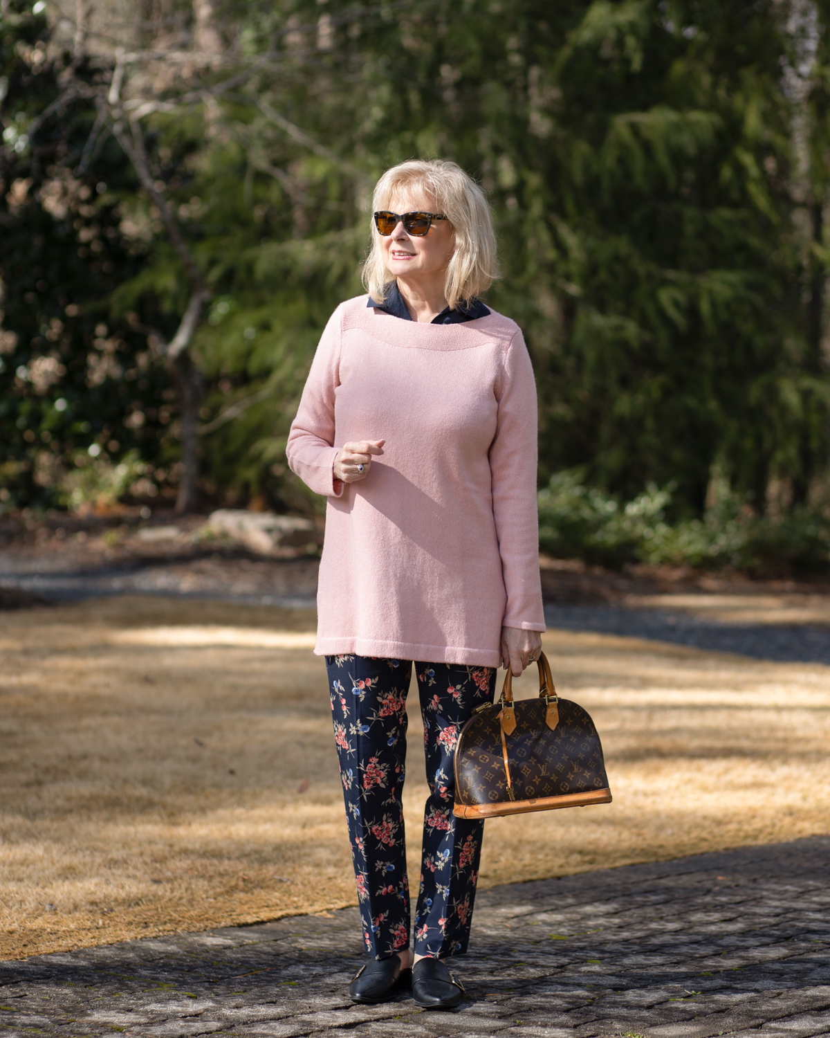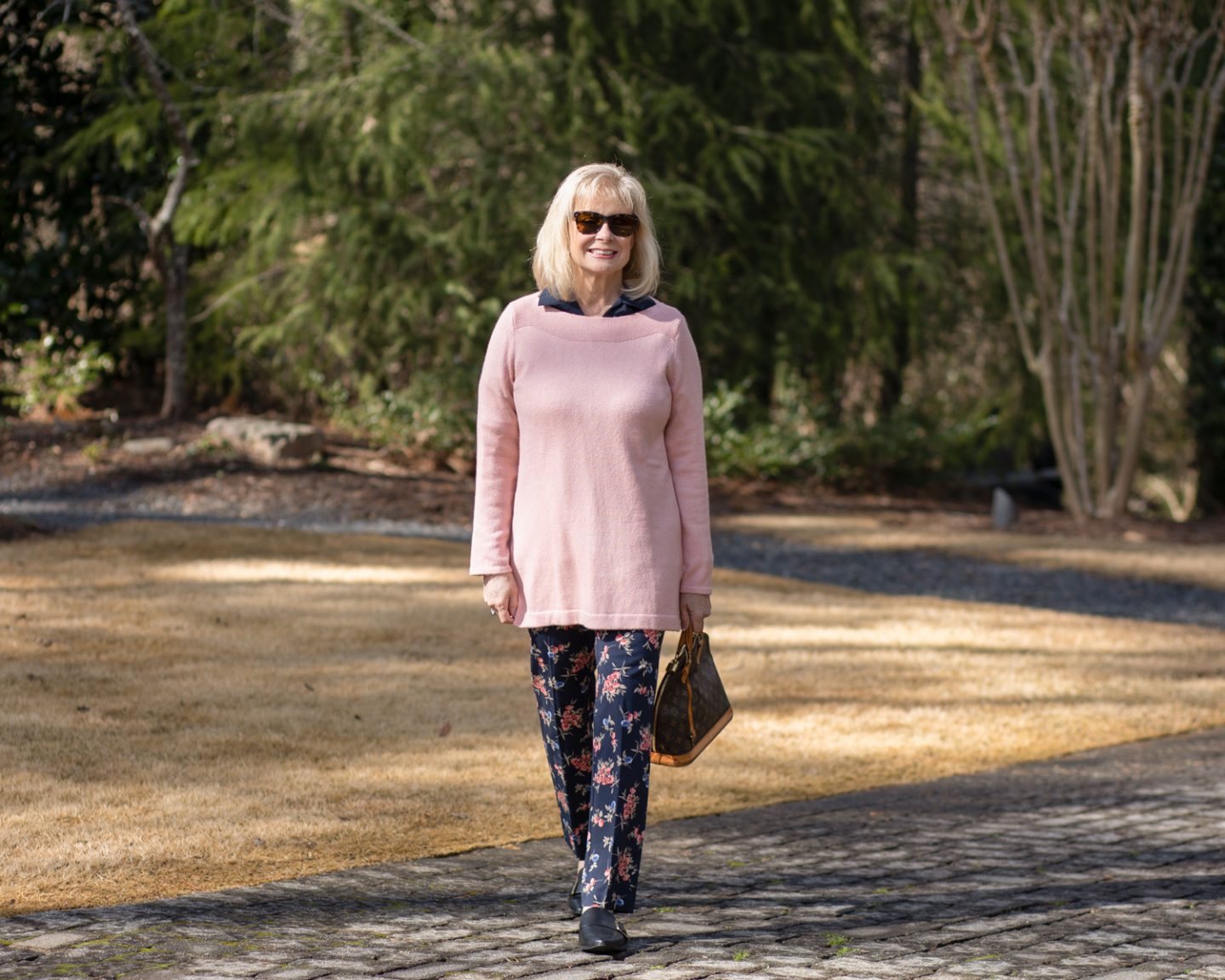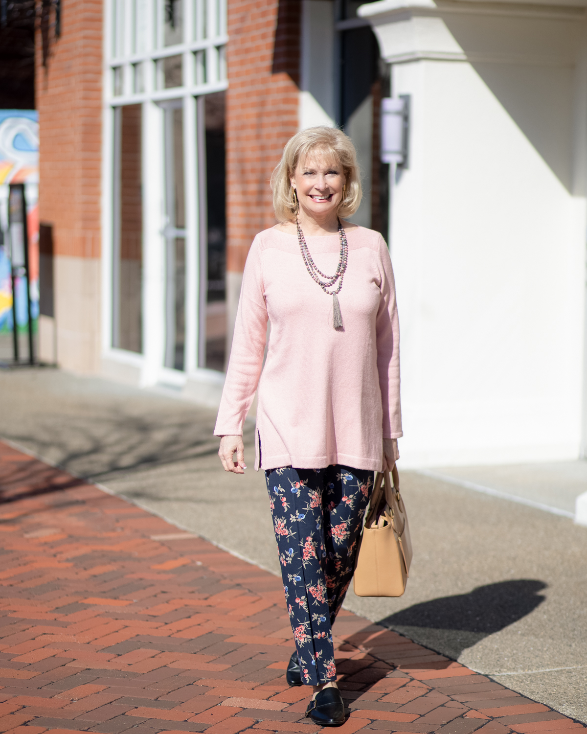 Love that sweater! I’ve always loved a blush pink and it really looks great with the navy. The pants are adorable and great for Spring too. Looking fabulous!