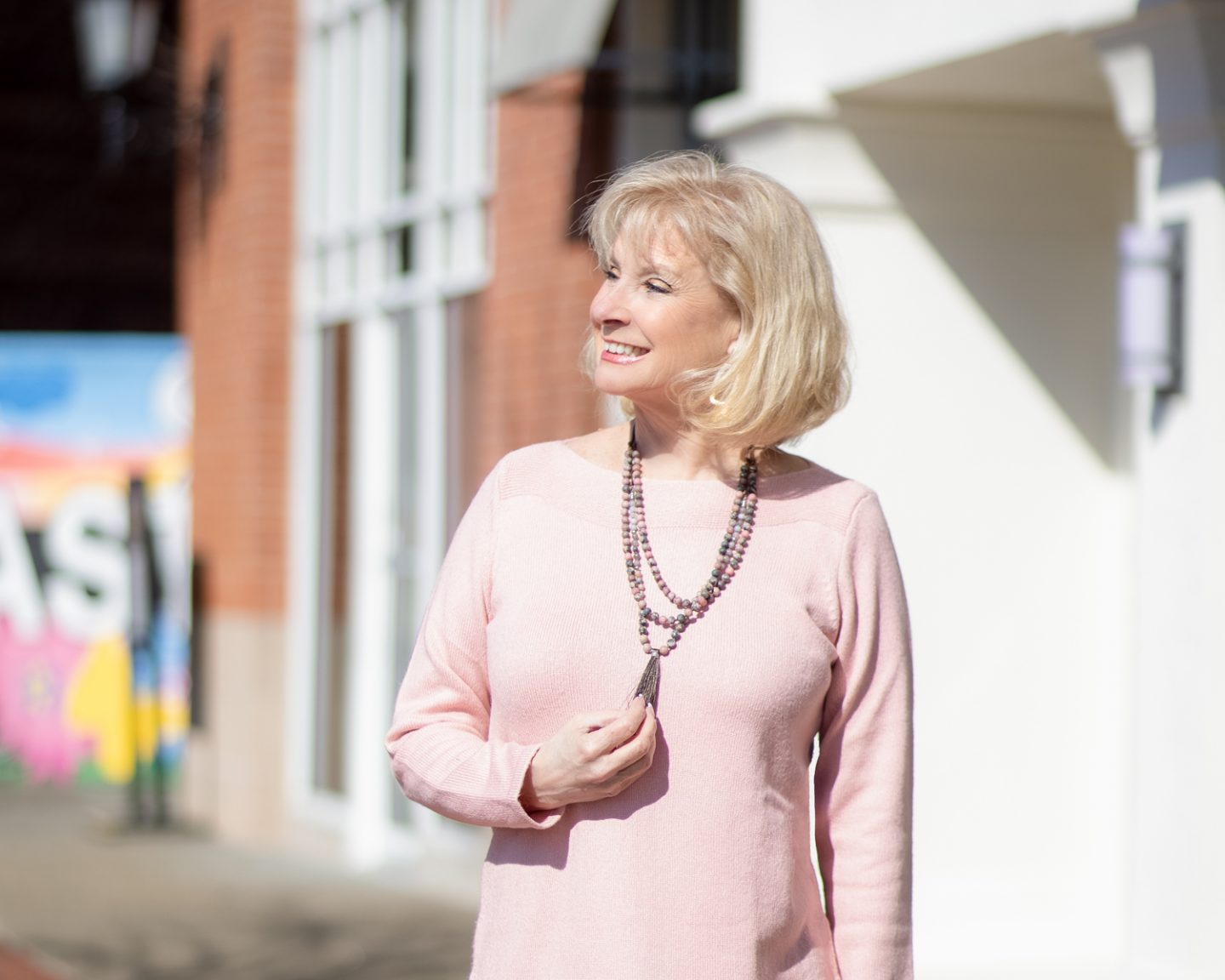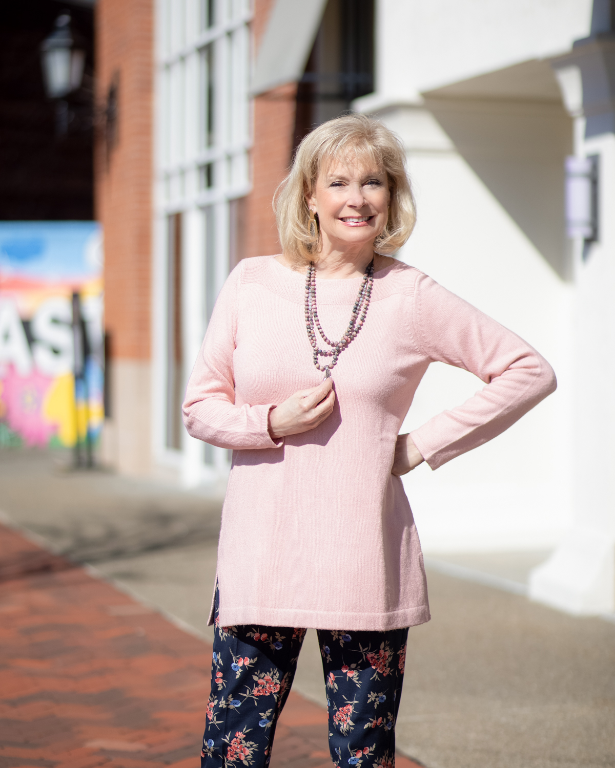 I purchased the boat neck sweater tunic in misty rose, Pink is such a happy color and I love the length of the tunic. I added the semi-precious double strand necklace for my accessory.