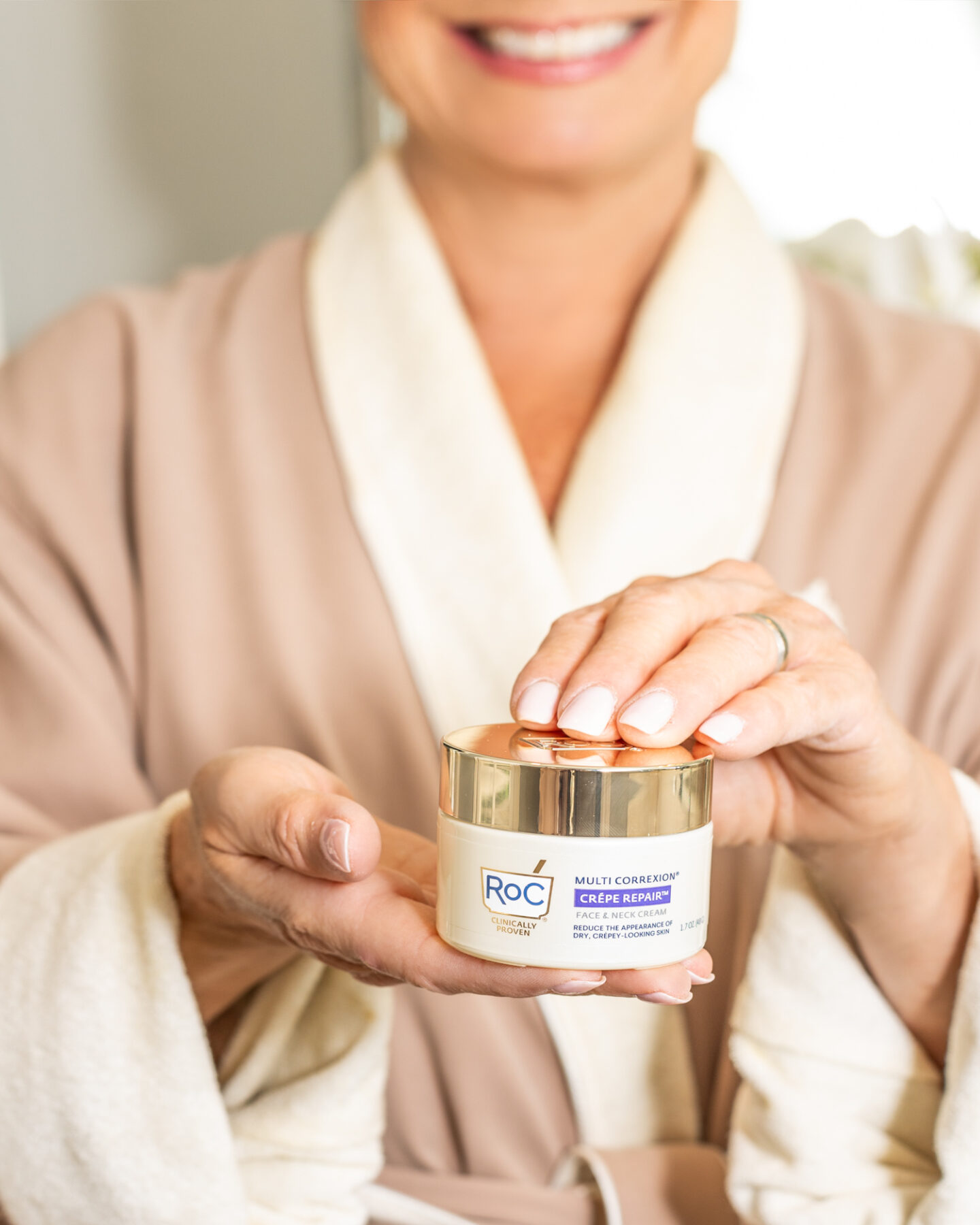 I noticed my neck and decolletage area has really shown signs of aging and wanted a skin cream that addresses my crepey skin. I have been using the RoC®️ Multi Correxion®️ Crépe Repair Cream for my neck.