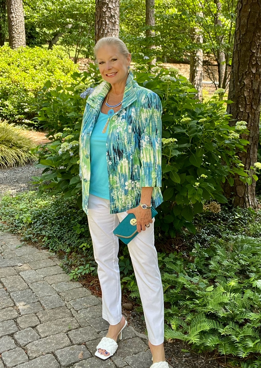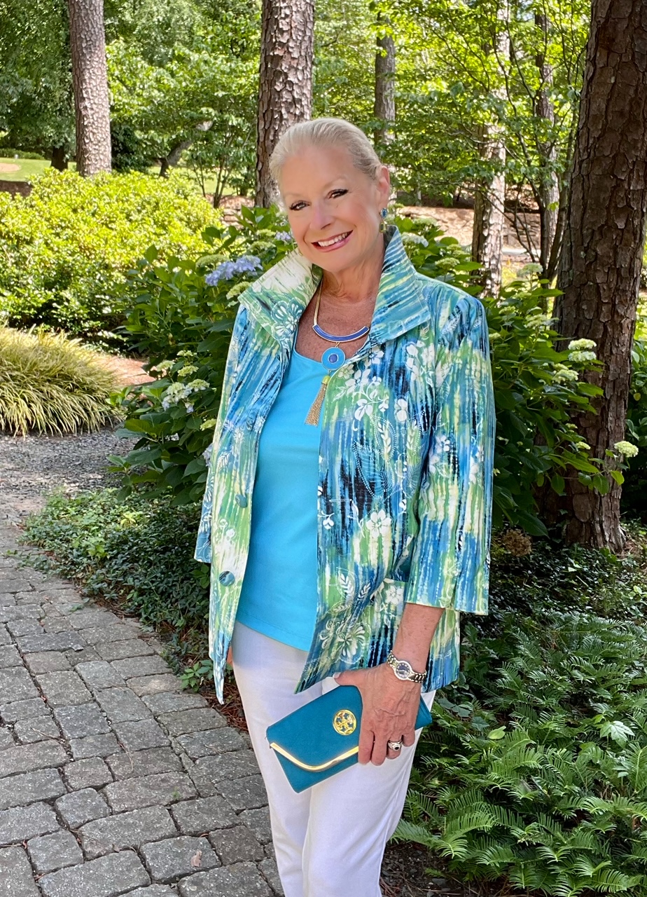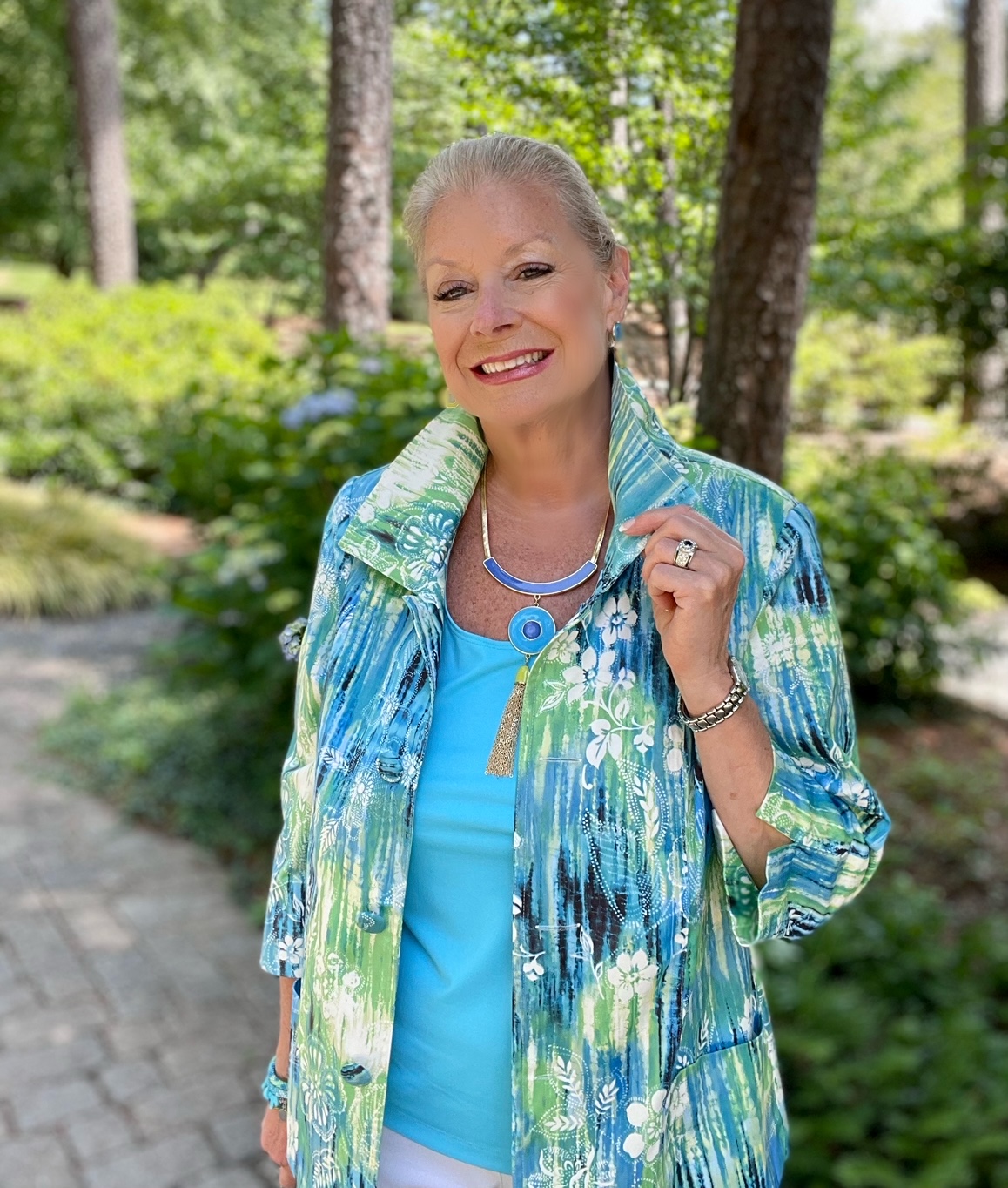 Draper’s & Damon’s have many beautiful fashion jackets, but I fell in love with this fabulous Lanai Floral Jacket! I love the blue and green colors (my favorite color combination), and it’s very lightweight. Because it’s so light, you can easily wear the jacket in the spring and summer when you need an extra layer. The collar is stiff which is perfect for those who like to “pop your collar” like me! For sizing, I am wearing a medium in the jacket. I am so happy that this beautiful jacket is still available at Draper’s and Damon’s!