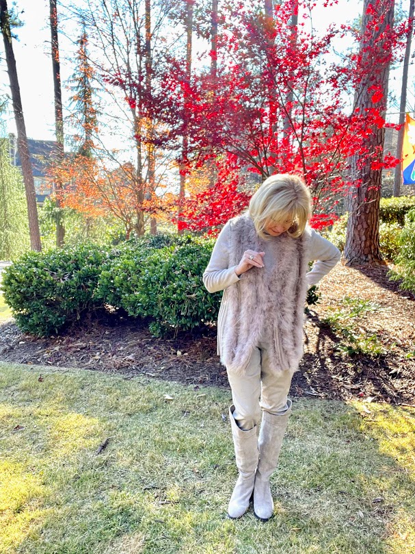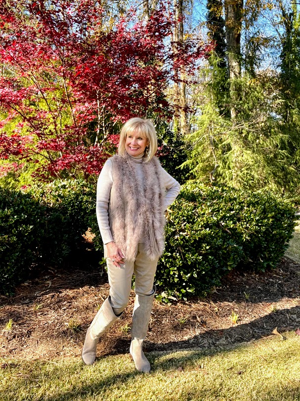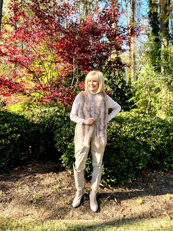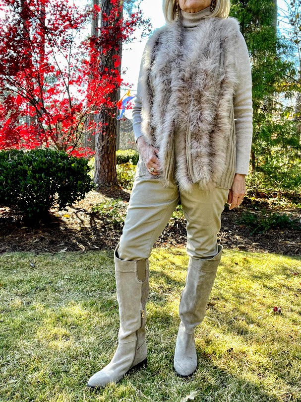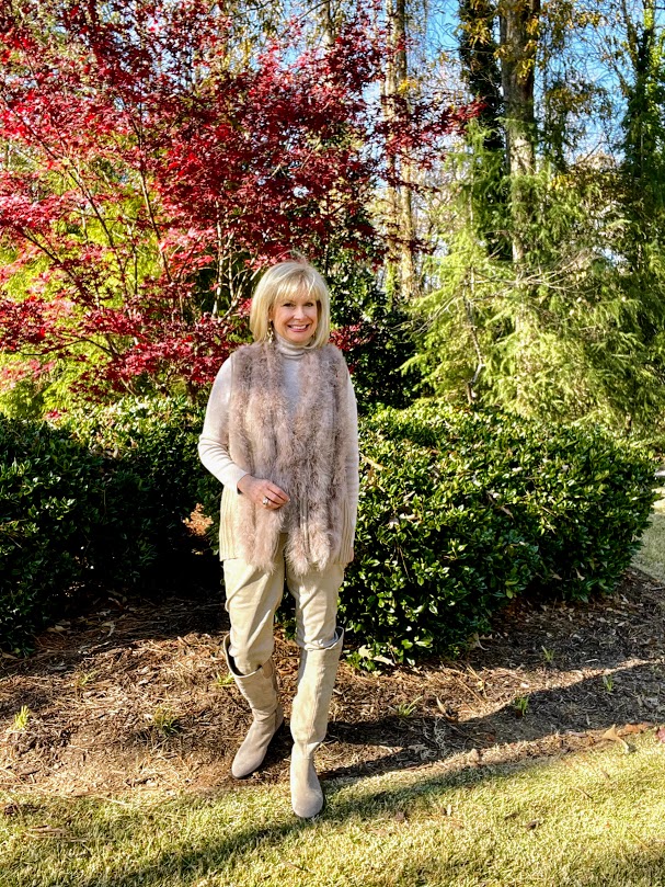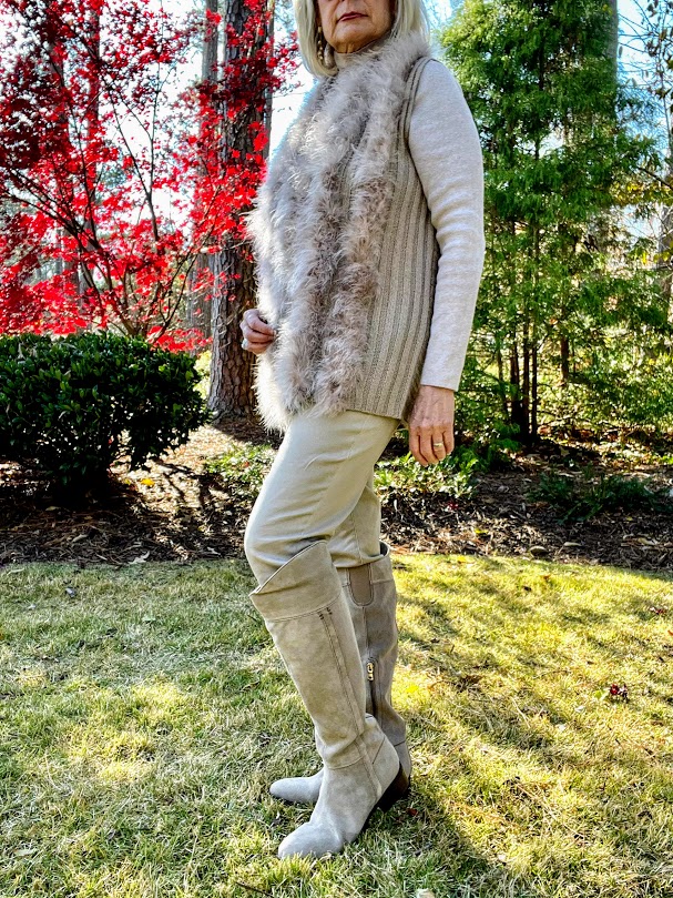This looks so good on you Robin and you are right the textures, colors, patterns all make such a difference! Your Bare Traps look so warm and cozy too, especially with that fur vest! Beautiful and elegant as always!