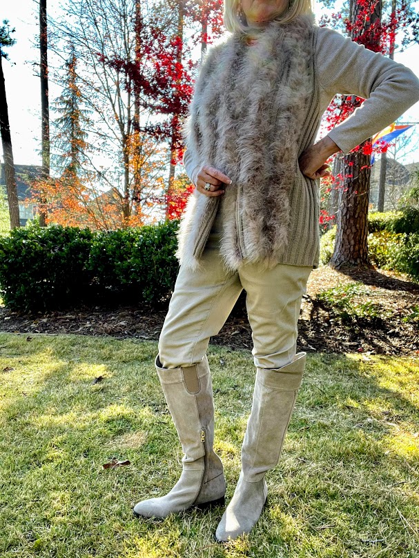I am wearing an outfit from my closet that is from Chico’s but I updated the outfit by wearing new suede boots from Baretraps.