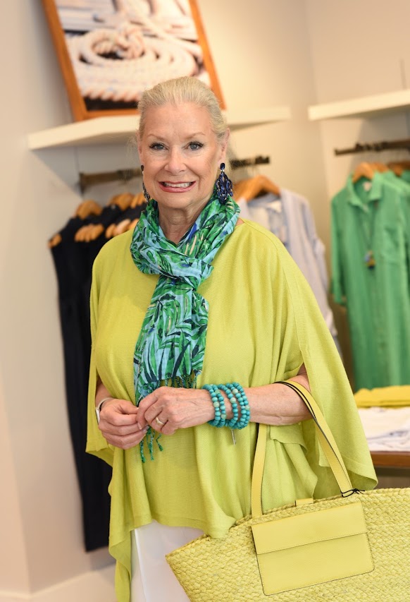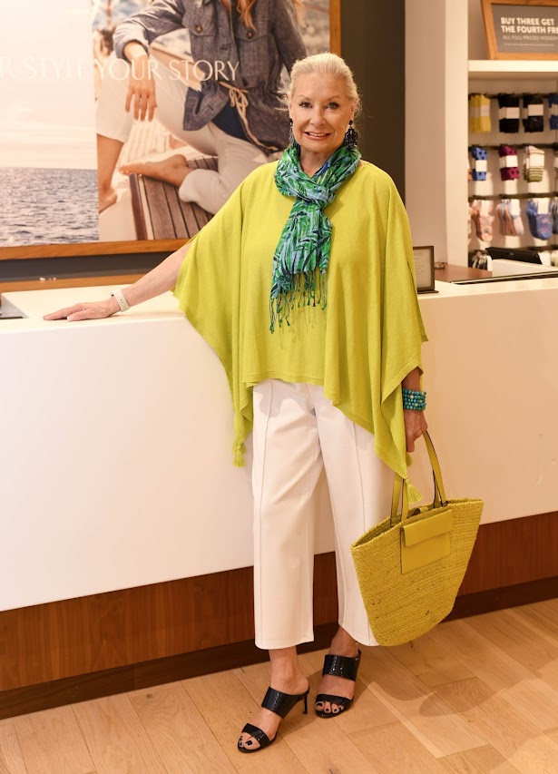 Because citron can be a harsh color for my skin type I’ve added this scarf to keep the citron color away from my face. Wearing a dark statement necklace would also be a great accessory to wear with this poncho. I have a navy multistrand necklace from Chico’s that will look wonderful with the poncho this summer. This lemony green looks great with dark colors.