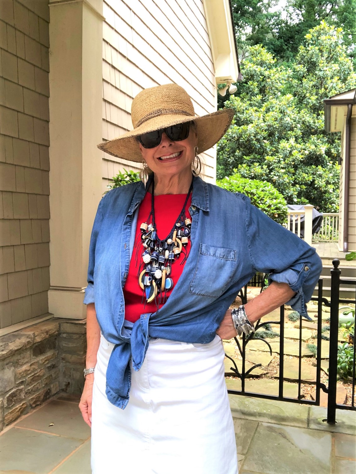 Instead of tucking it in the shirt, you can wear your denim shirt as an outer layer! Add a fun top underneath or a bold pop of color and you’re all set! I wore my denim shirt knotted as an outer layer this past spring for a patriotic look. Read more here.
