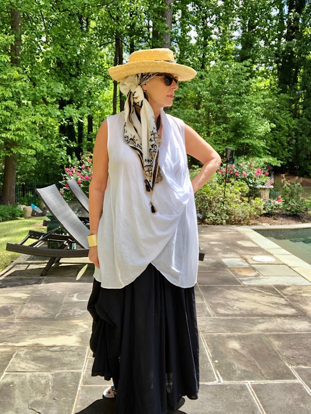 I made a bolero out of this black and white scarf by tying the ends together. It’s a beautiful coverup over my black swimsuit.