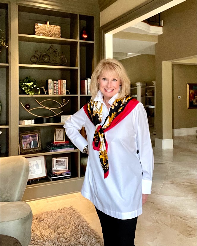 I love the pop of color I get when wearing this silk scarf over this white tunic.