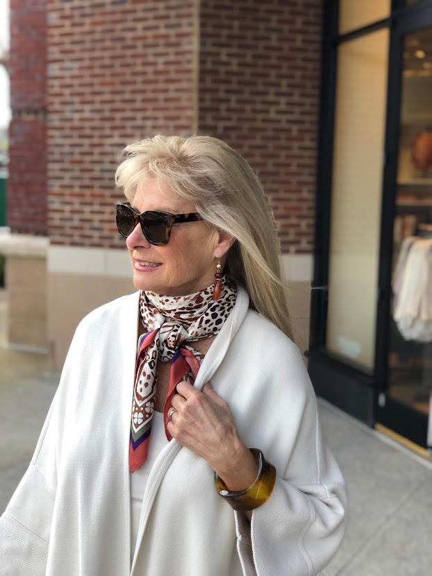 I love the pop of color I get when wearing this silk scarf over this white tunic.