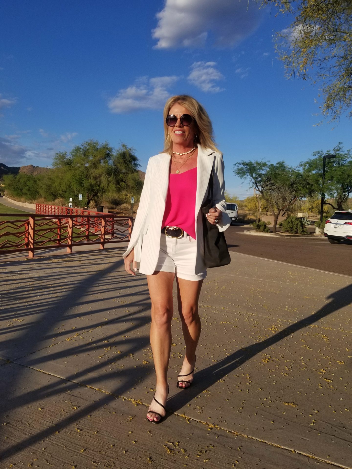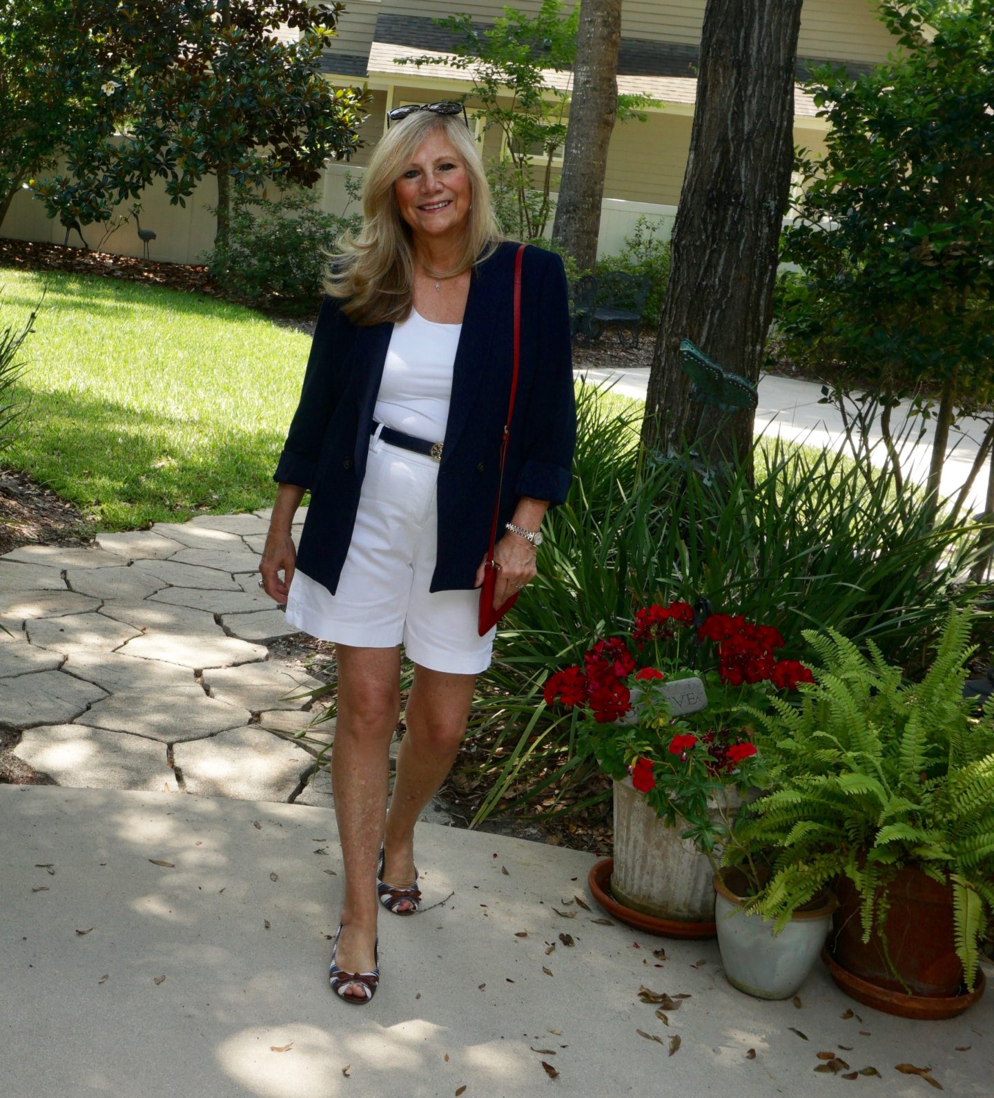 When I read Rosemary’s blog, last week I knew I needed to write about blazer and shorts. She calls this look a “Short Suit.” Her shorts are a perfect length for me and the outfit is perfect for a 4th of July party. Follow Rosemary on Instagram @distinctlysouthernstyle.