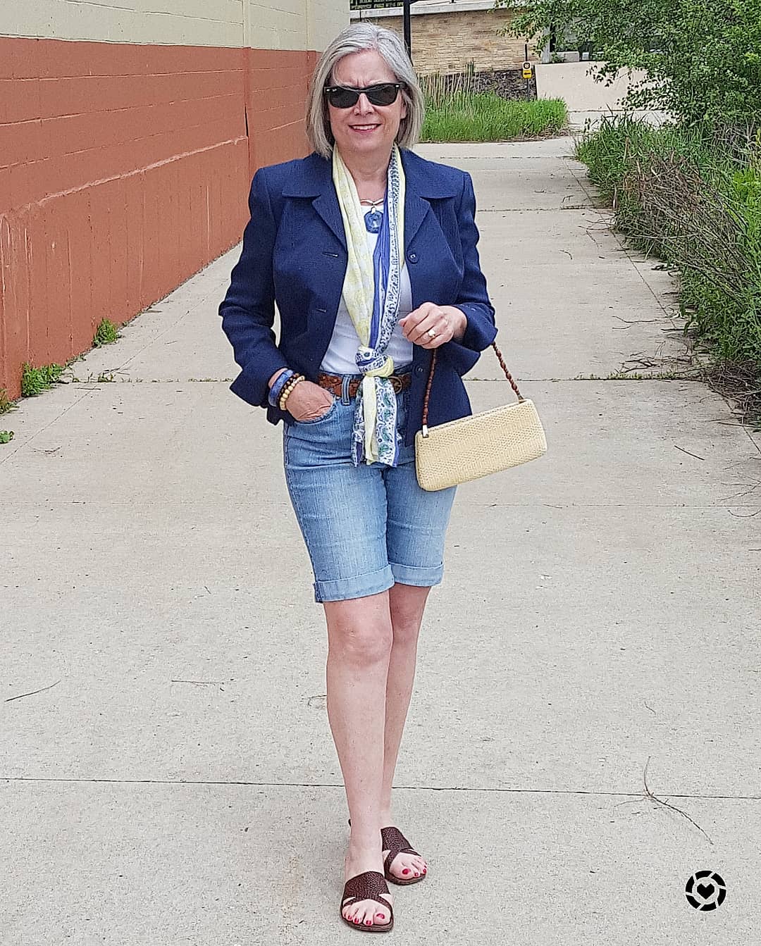 I just did an Instagram group collaboration with Susan about wearing denim in the summer and she actually wore denim shorts with her blazer. You can follow Susan on Instagram @Fashionablyfifty