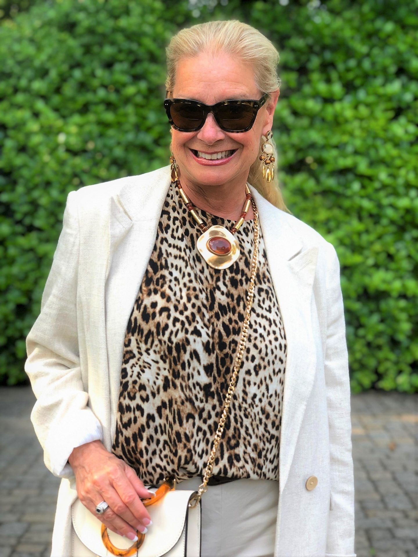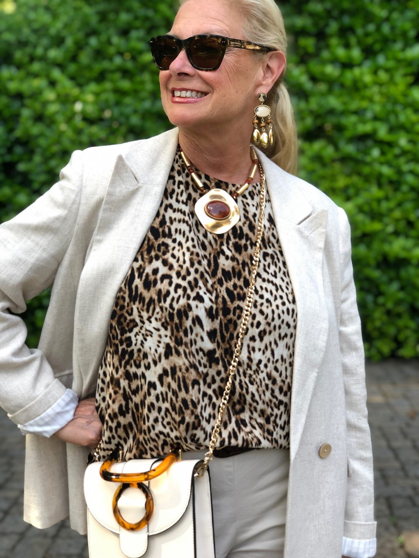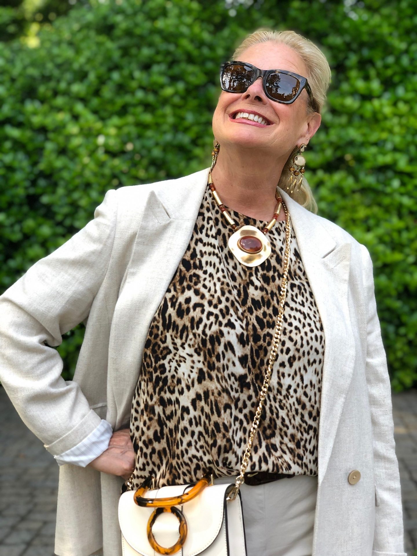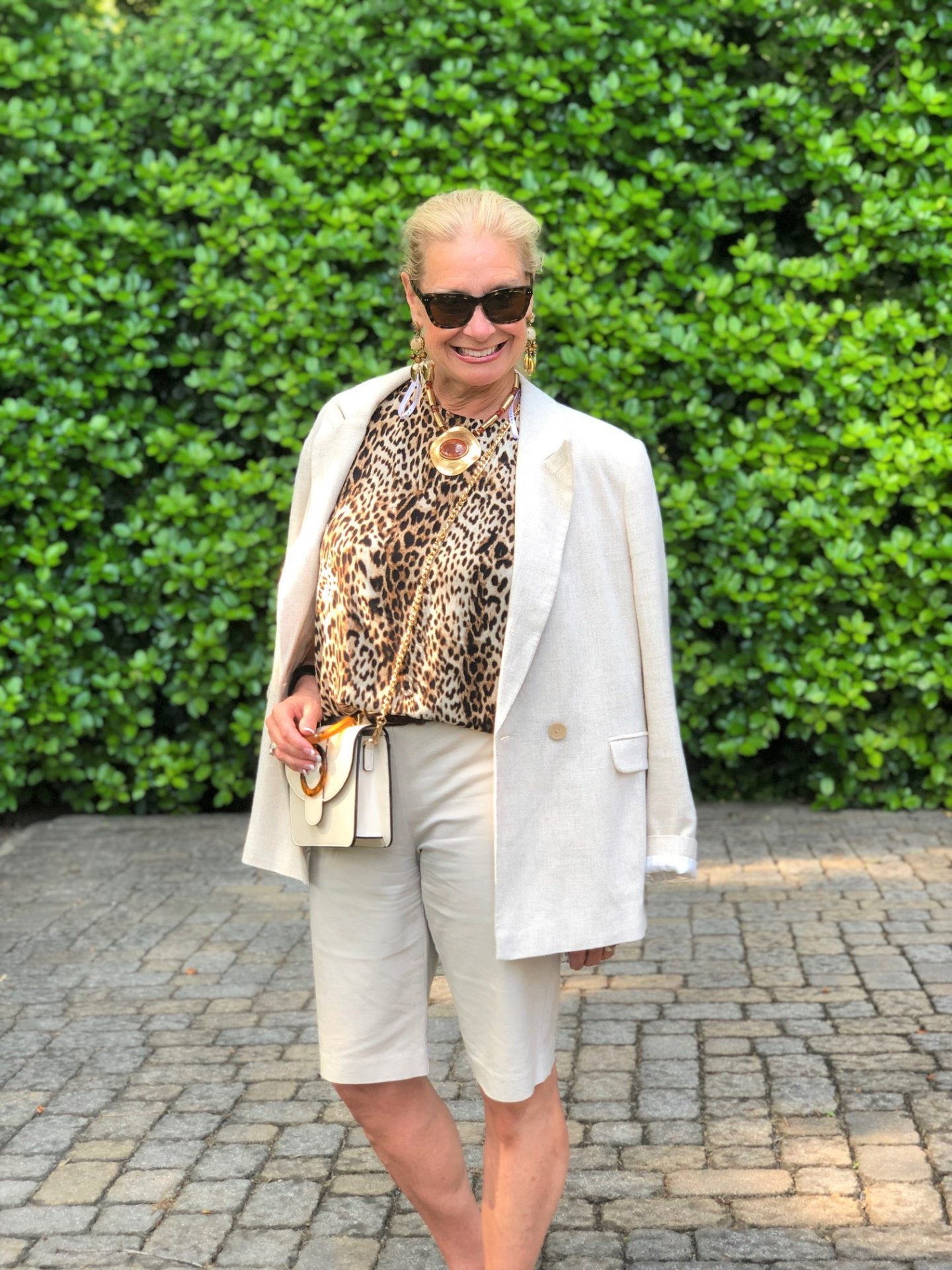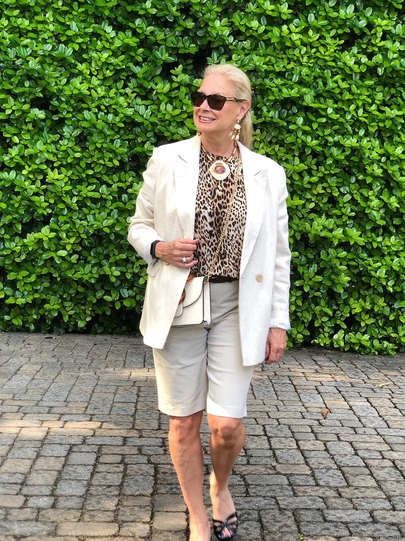 My Linen blazer and cross body bag are new and on sale. Leopard print top, jewelry, and so slimming shorts are from Chico’s. I have worn my leopard print shirt and jewelry many times before. I tucked the long leopard shirt into my shorts and added a belt (even though these shorts are pull ons.)