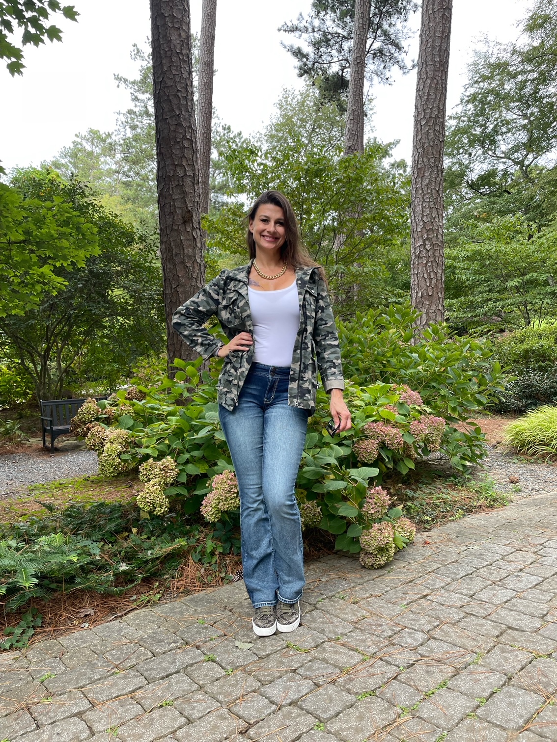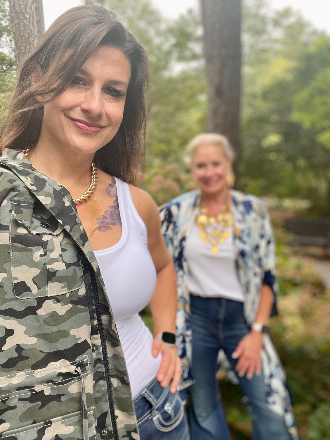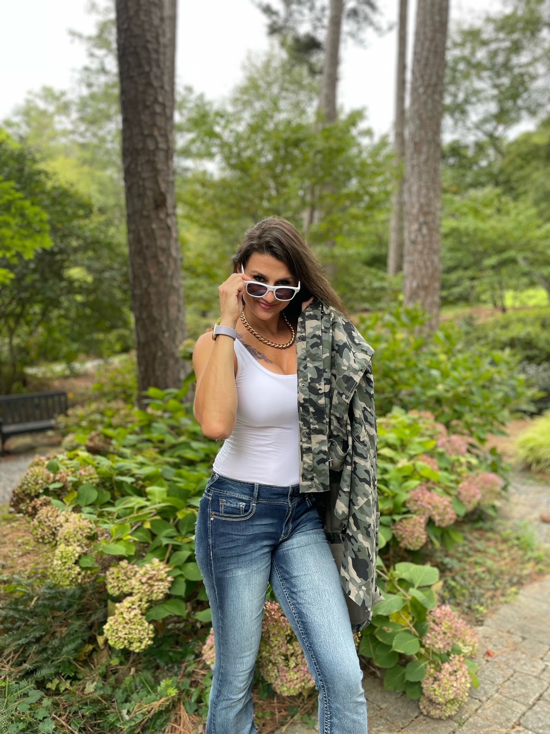 Lisa has a minimalist sense of style and doesn’t wear jewelry as I do. It’s probably because she’s used to wearing gym clothes as a fitness instructor. Lisa is wearing a Jockey tee shirt and jeans from Target. She borrowed my camo jacket and snake print sneakers to finish her look. It’s so fun when my daughter raids my CLOSET for style inspiration!