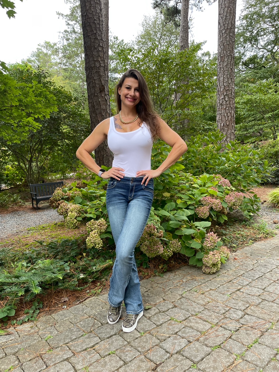 Every once in a blue runway, the most in-your-face trend revolves around an item you already know and love (and have in your closet). It’s not polarizing or wallet-breaking, and it’s so versatile that it appeases the harshest closet critics. In the case of Fall 2022, we’re talking about a white tank top. I’ve invited my daughter Lisa to join me this year on some of my fashion posts to show how a forty-five-year-old woman would style an outfit or piece of clothing I’m wearing as a sixty-five-year-old woman. We both have a different sense of style, so I thought it would be fun to do this with her. So today, we’re styling a white tank top with jeans.