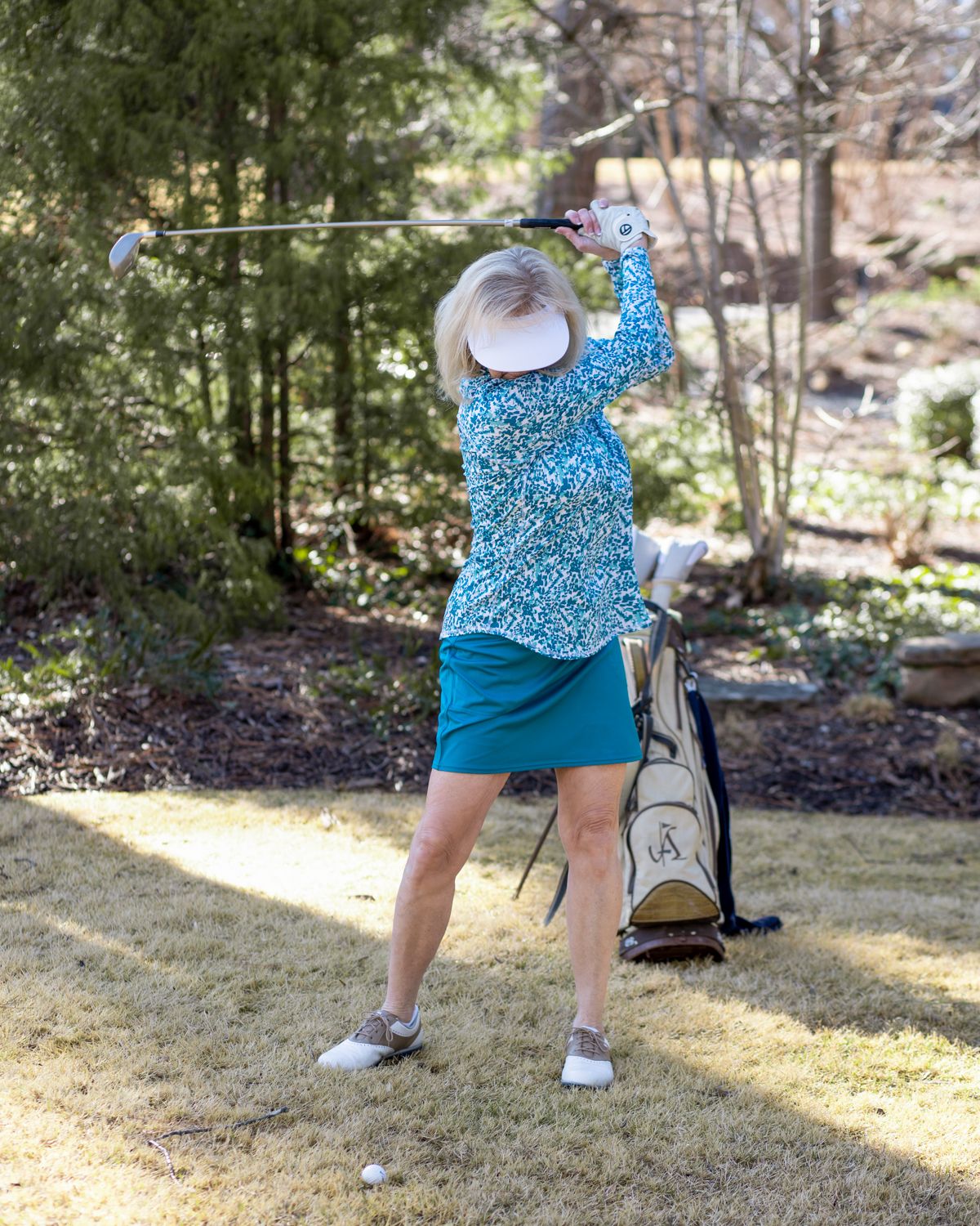 You and your golfing friends must be the most stylish women on the course. These outfits are so pretty – I love the teal color of that skort and the matching top in white and teal is stunning!