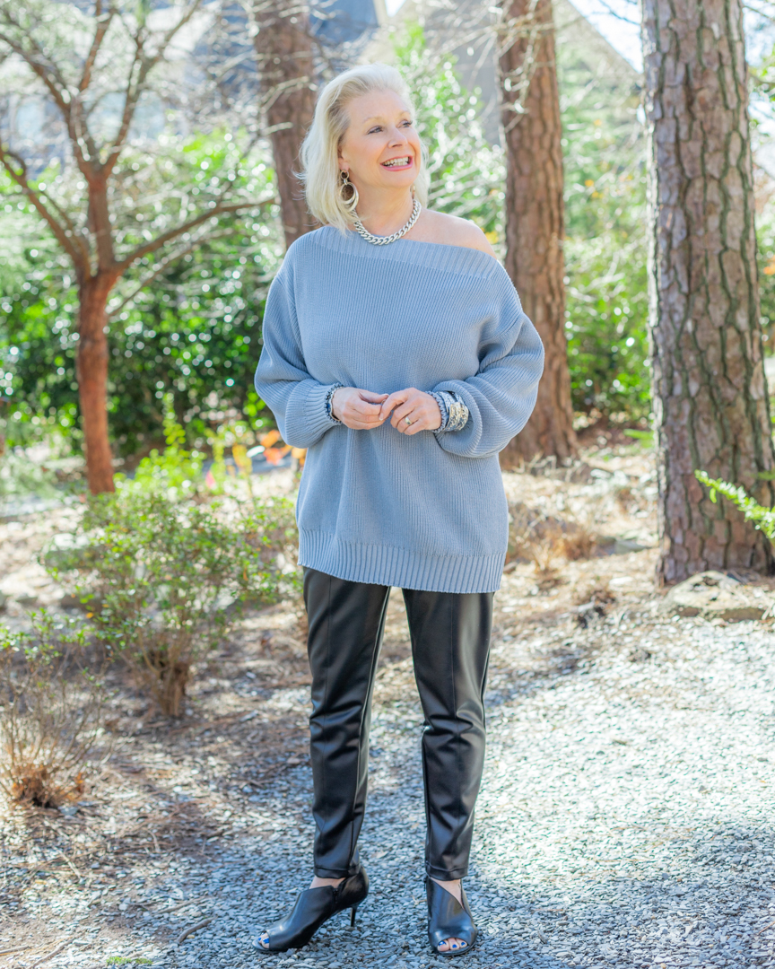 This boatneck Henley sweater from Saint and Sofia wasn’t meant to be an off-the-shoulder sweater. It just happened to drop off one shoulder. My photographer liked the way I looked and said not to adjust it. She’s in her twenties and thought I looked great this way. I have also worn it without baring my shoulder.