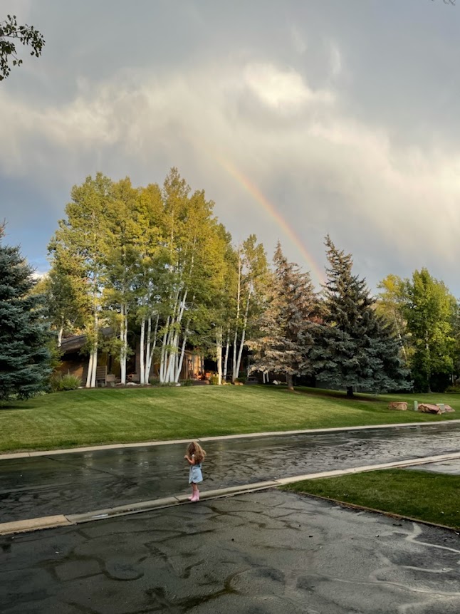 It rained one evening in Park City and this photo of Livie in her favorite pink rain boots (which she wears every day!) with the rainbow above made me think of Bruno. He is looking over our sweet granddaughter from the rainbow bridge. Bruno loved Livie so much.