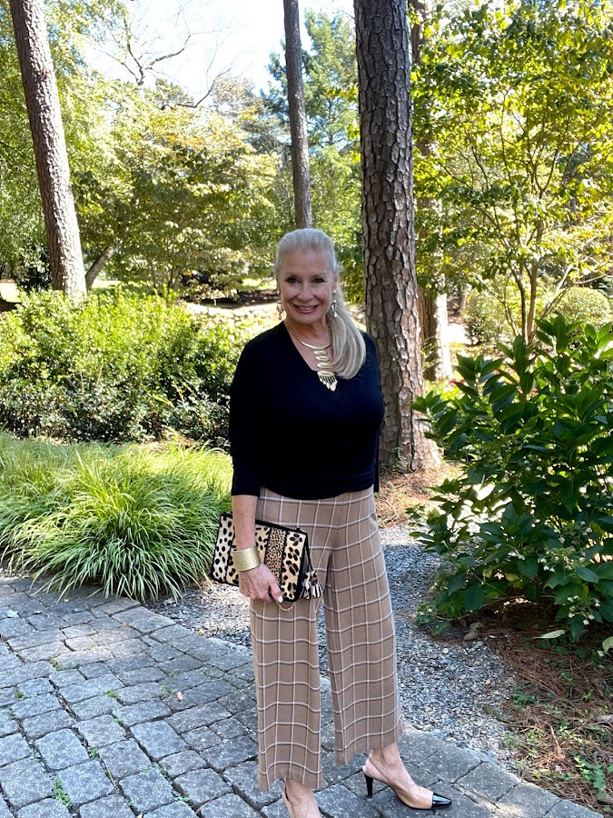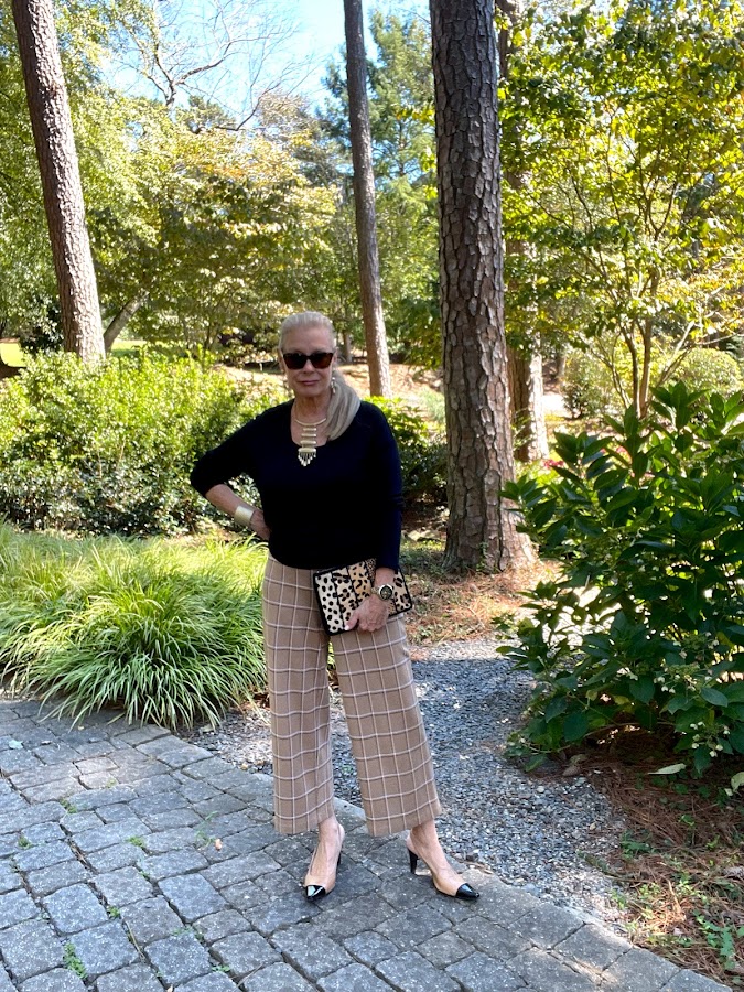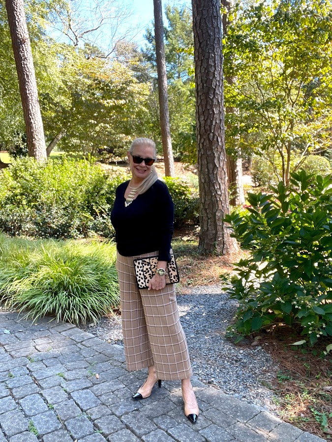 For my Sunday style, I am wearing this soft wrap-around sweater from Stitch Fix with my cropped wide-leg pants that are a couple of years old from J.Jill. Wide-leg cropped pants are back in style again. it’s nice to be able to wear clothes year after year.