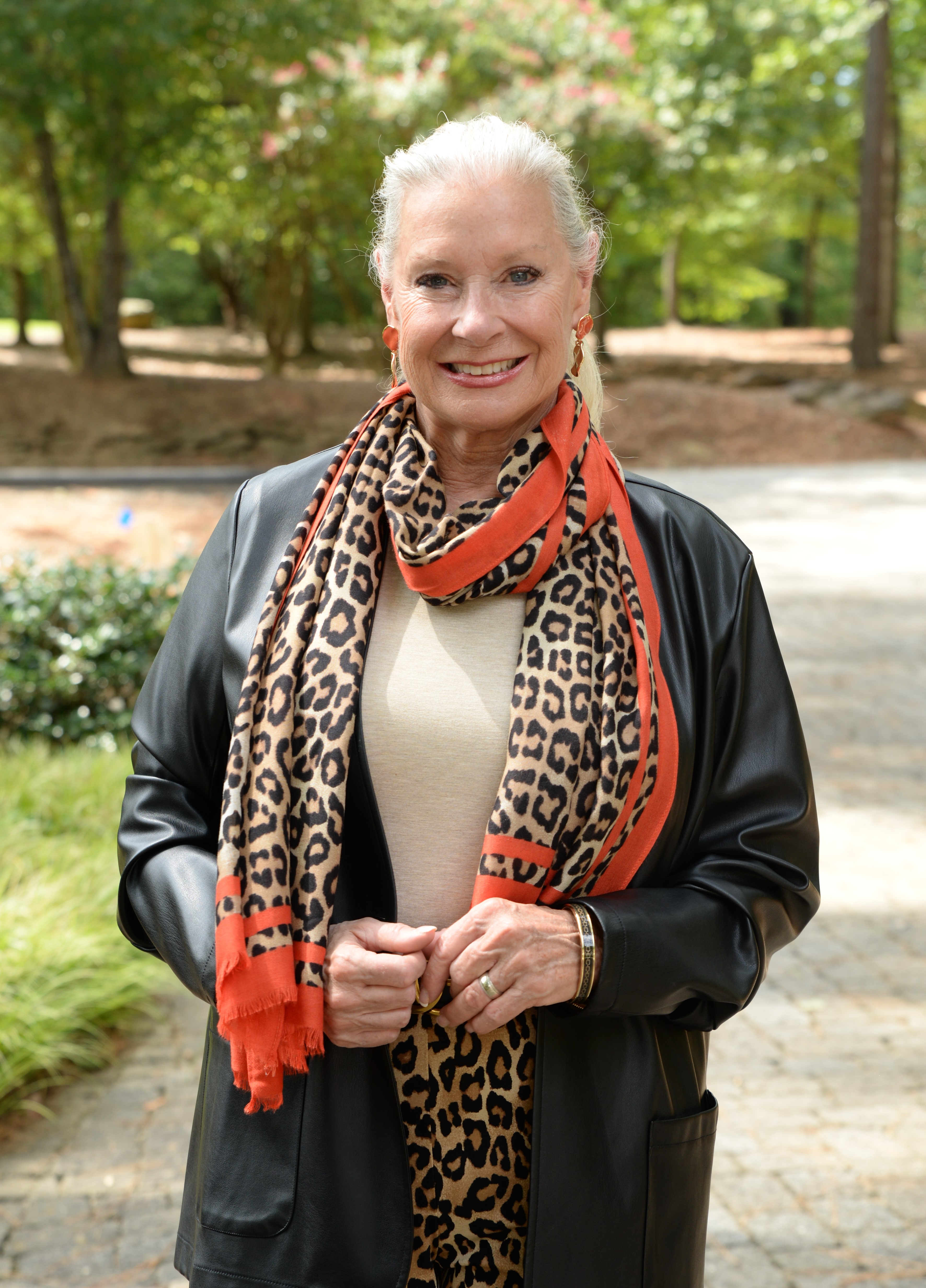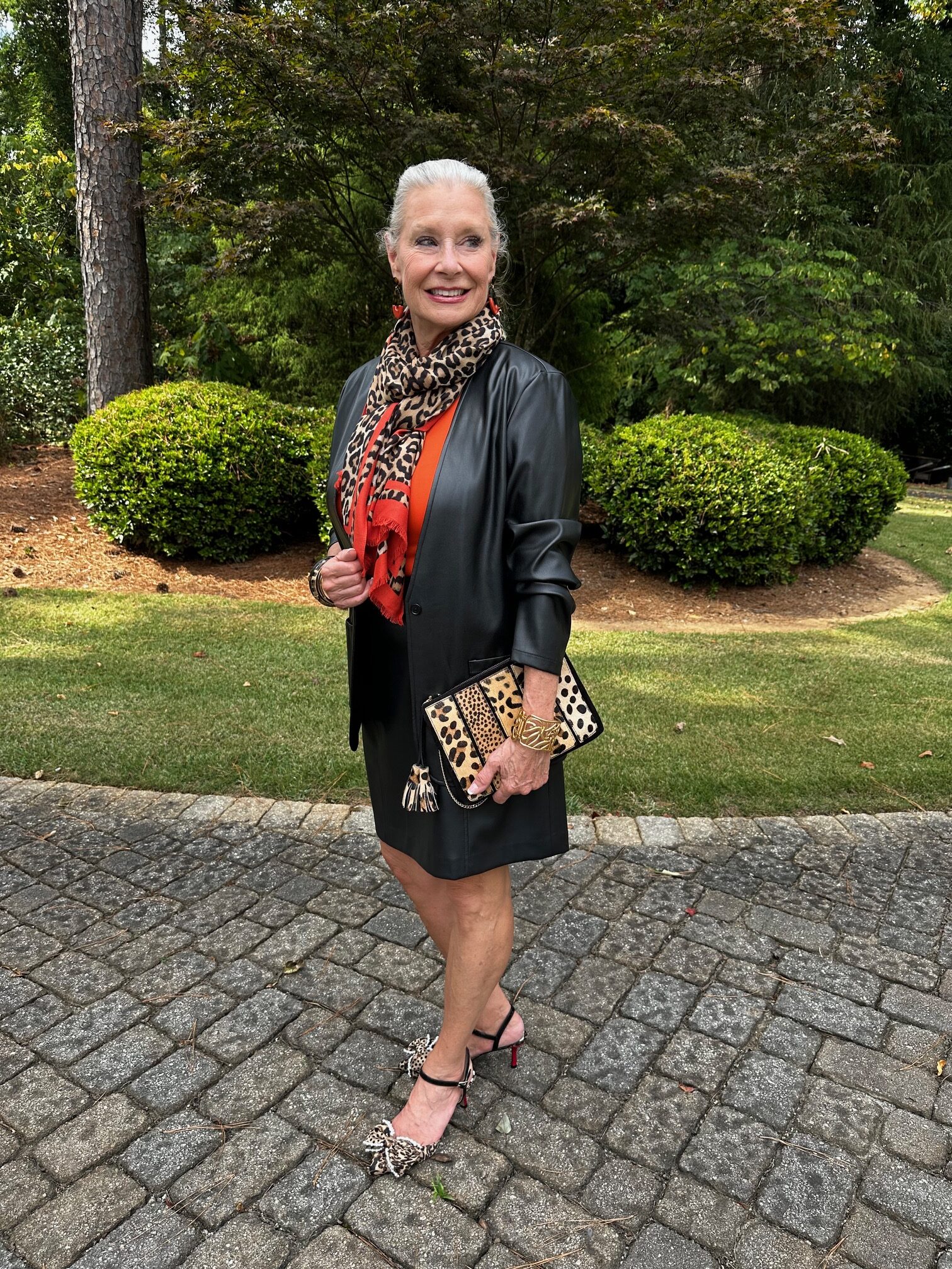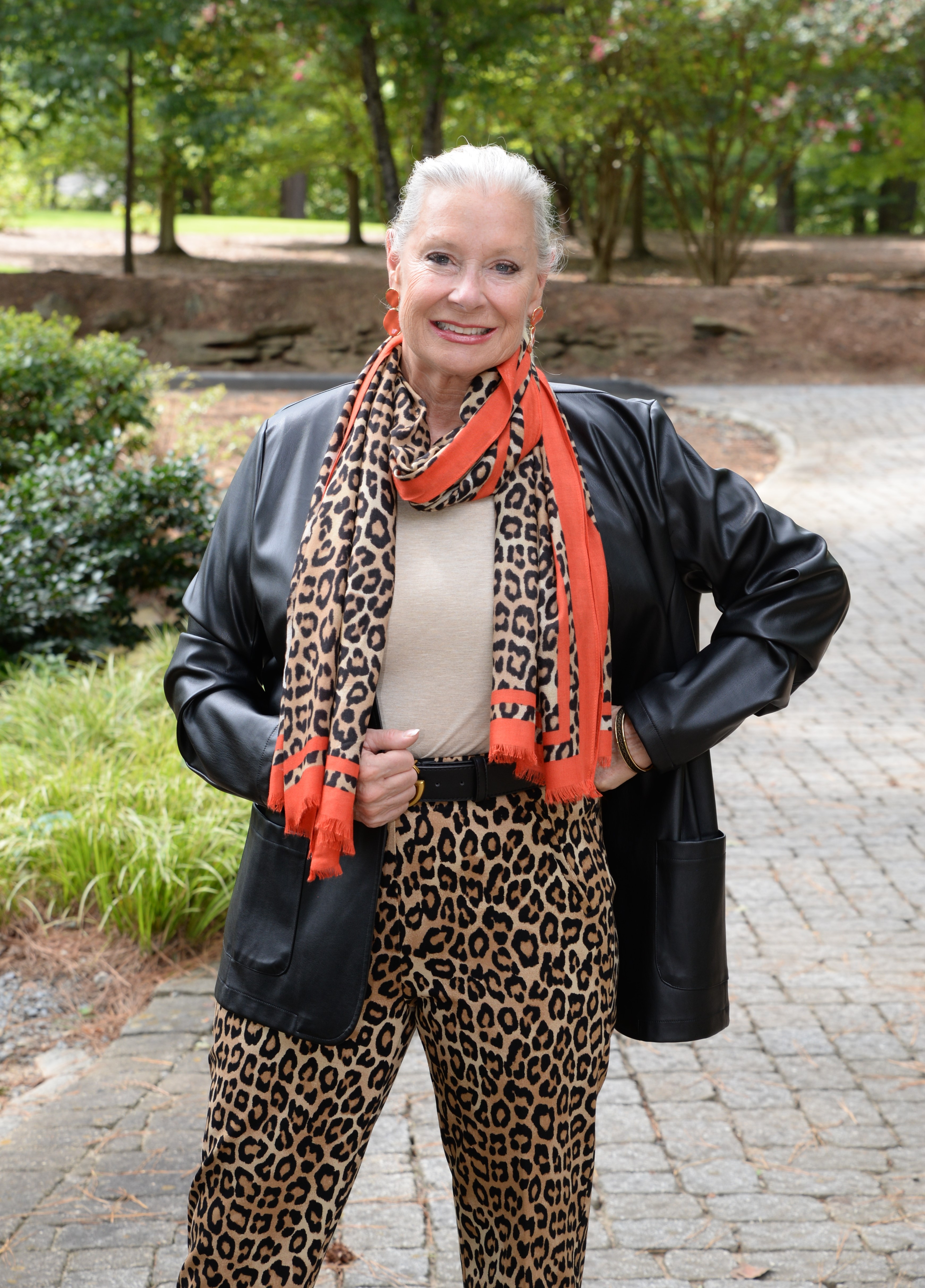 I have been wearing this print for the past eight years, and I’m so happy to see it trending again this fall. Chico’s has a lot to choose from when it comes to leopard print. I picked up the Juliet Ponte Leopard Slim Ankle Pants and the Leopard Print Oblong Scarf to wear with my faux leather jacket. Since I was already shopping, I picked up the Touch of Cool™ Heather Short Sleeve Layering Tee and the No Droop™ Orange Round Drop Earrings to pull the color of the trim on the scarf upwards.