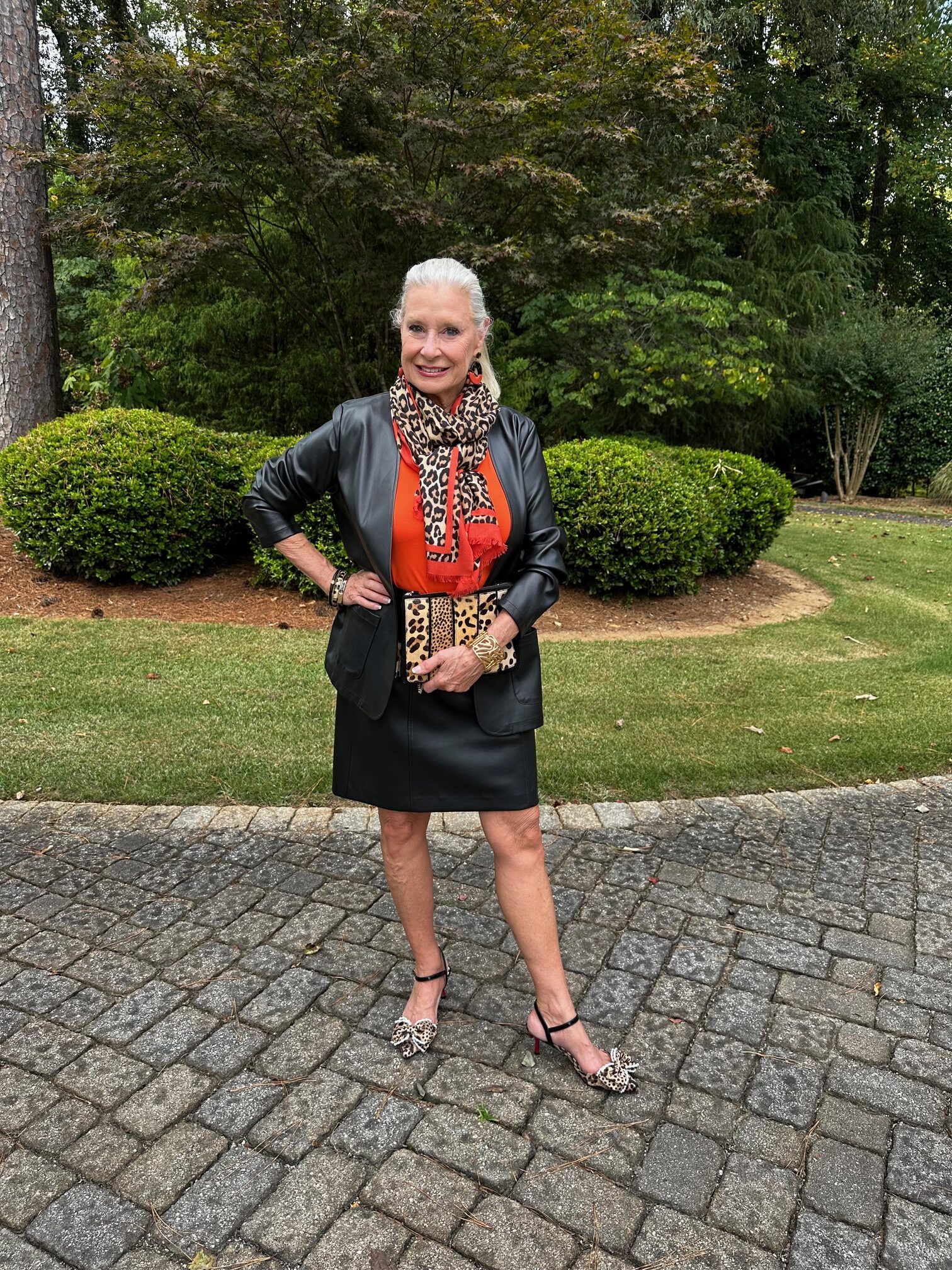 This time I am wearing the Leopard Print Oblong Scarf with the Touch of Cool™ Short Sleeve Tee in Candied Orange. The faux leather jacket and skirt are from last year. The clutch is another oldie from Chico’s. However, the Betsey Johnson Felipe Pump and the No Droop™ Orange & Tortoise Hoop Earrings are both new. Bold prints and pearlescent beading catch the eye and add vintage touches to a night-out look.