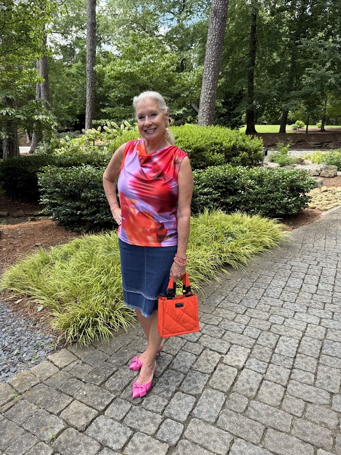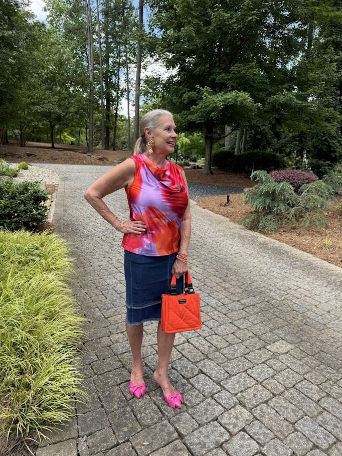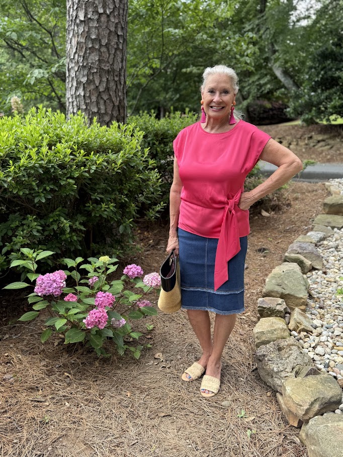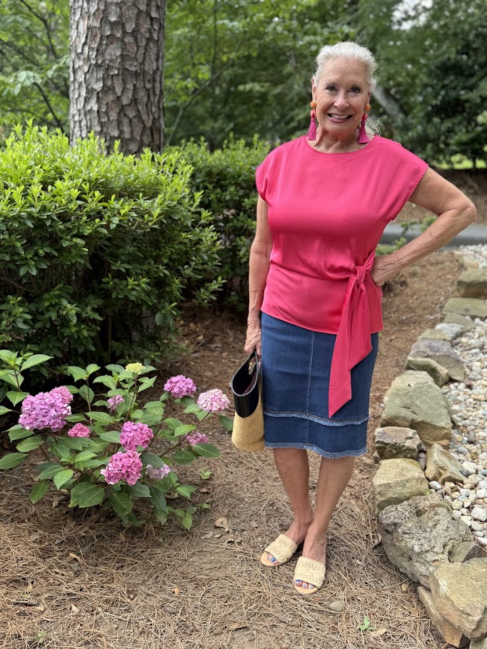 This time I’m wearing the Rosalia Tie Drape Mix Media Top with the Evelina Fringed Denim Pencil Skirt. Both tops would look great with pants.