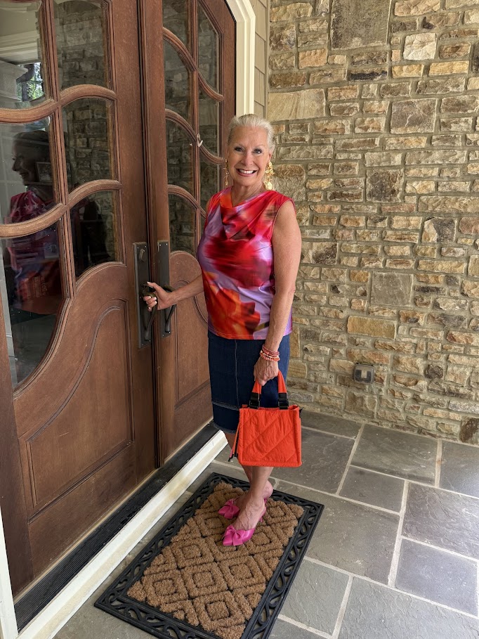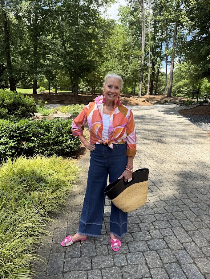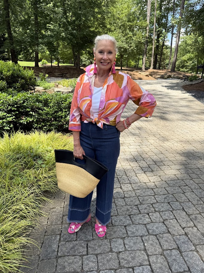 Take a look at these cute Fringe Hi-Waist Wide Leg Crop Denim from LYSSE. These wide-legged palazzo jeans feature a concealed, patented waistband and a clean front without side seams, resulting in a smooth, linear appearance. I’m wearing a shirt and earrings from Chico’s that I wore last year, which are no longer available. However, the St. Tropez Slide Sandals are available.