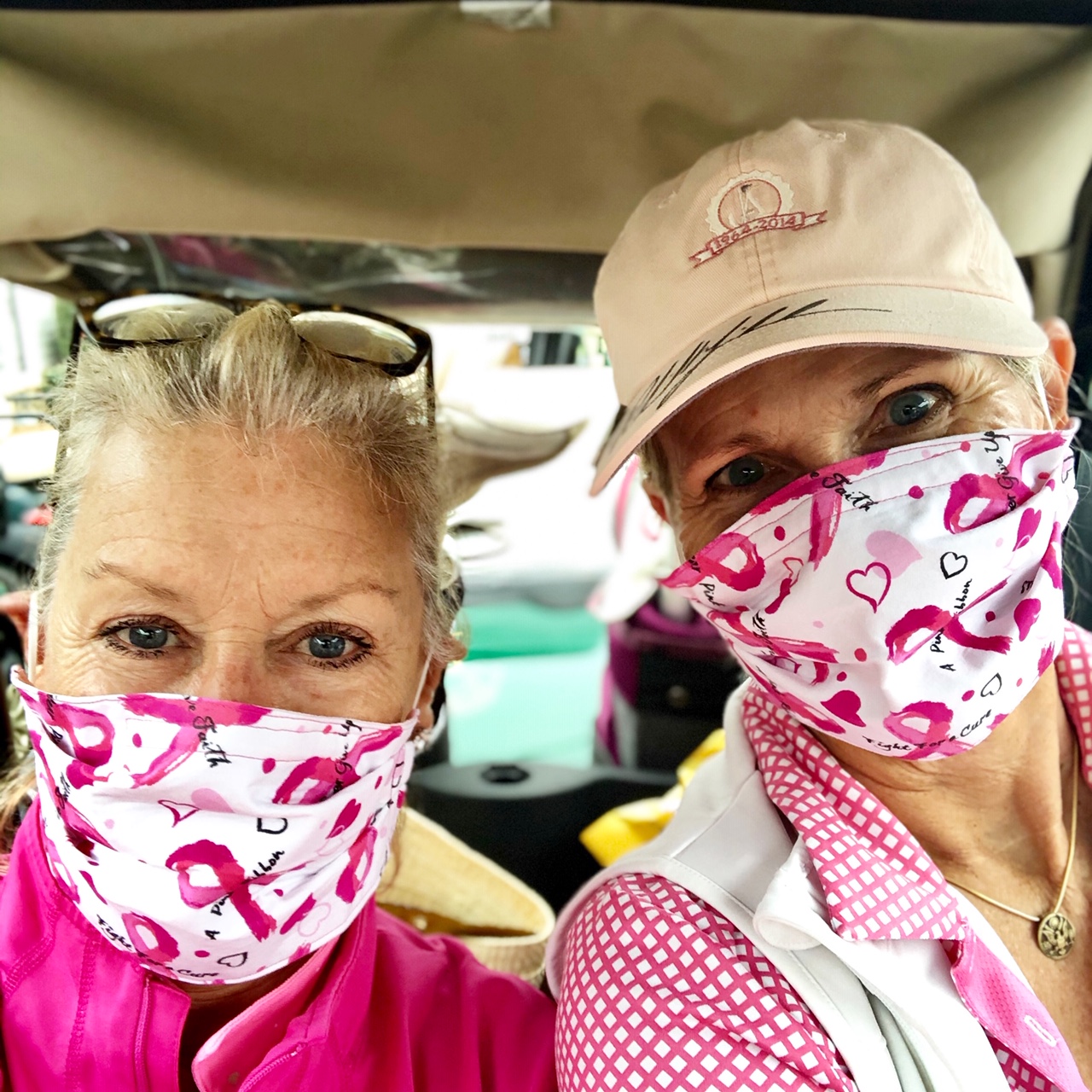 Have you been supporting breast cancer awareness this month? On Wednesday and Thursday, I spent the day golfing for a breast cancer charity in Georgia. These pink ribbon face masks were made by a dear friend of mine who was in my foursome. Aren’t they great!