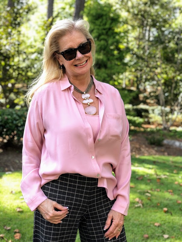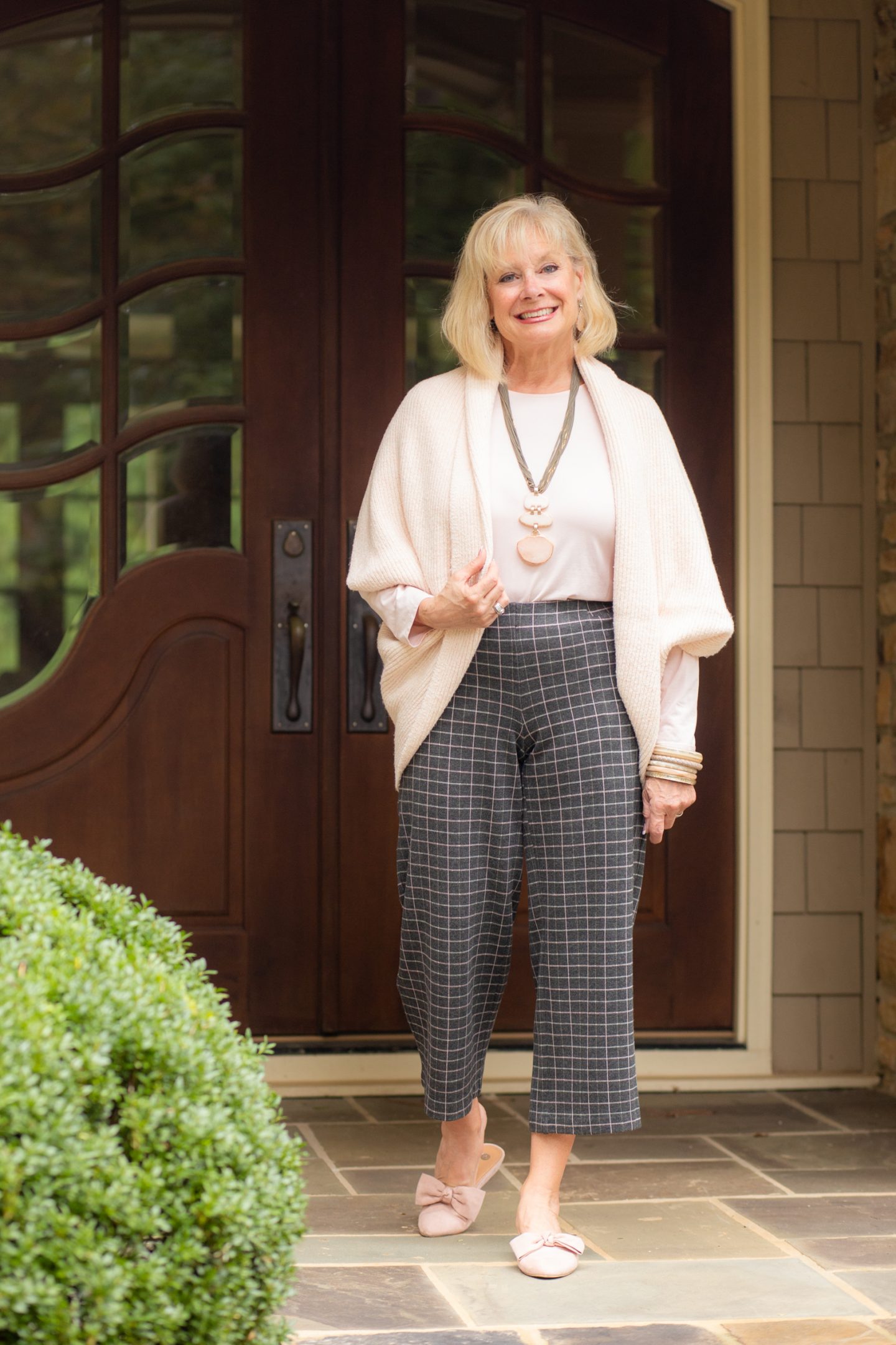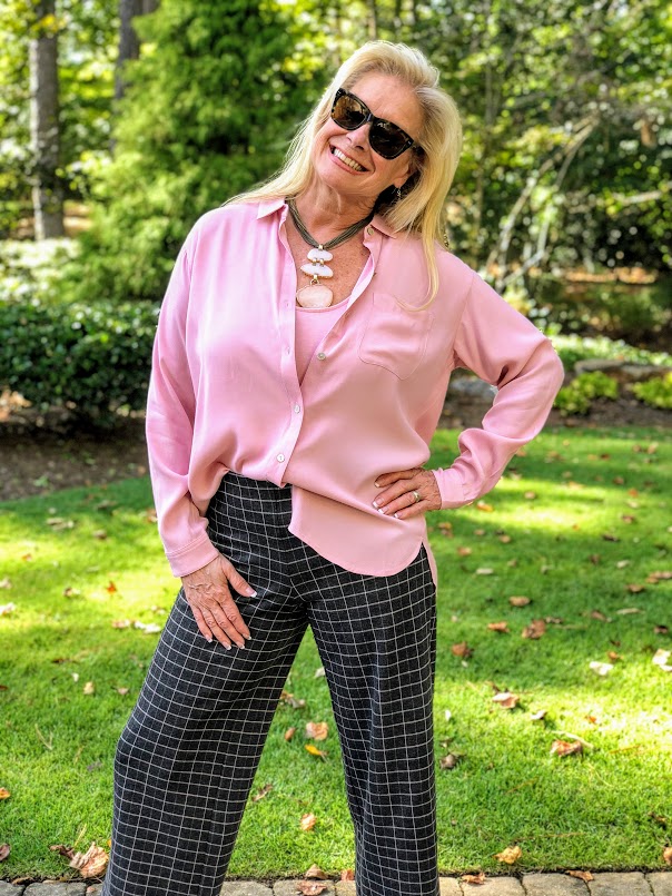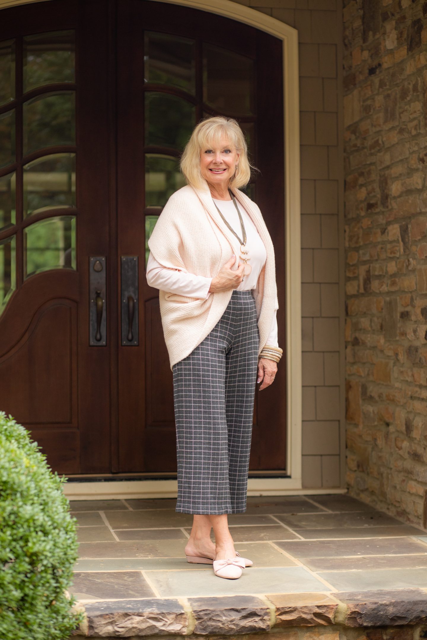 I first wore the black plaid wide-leg cropped pants with another pink blouse both fromJ.Jill two years ago but I switched up my top to a blush pink that looks softer and more feminine. I always look in my closet to see what I can wear again or fall. Paid is trending again this year so I don’t need to shop as much as usual.