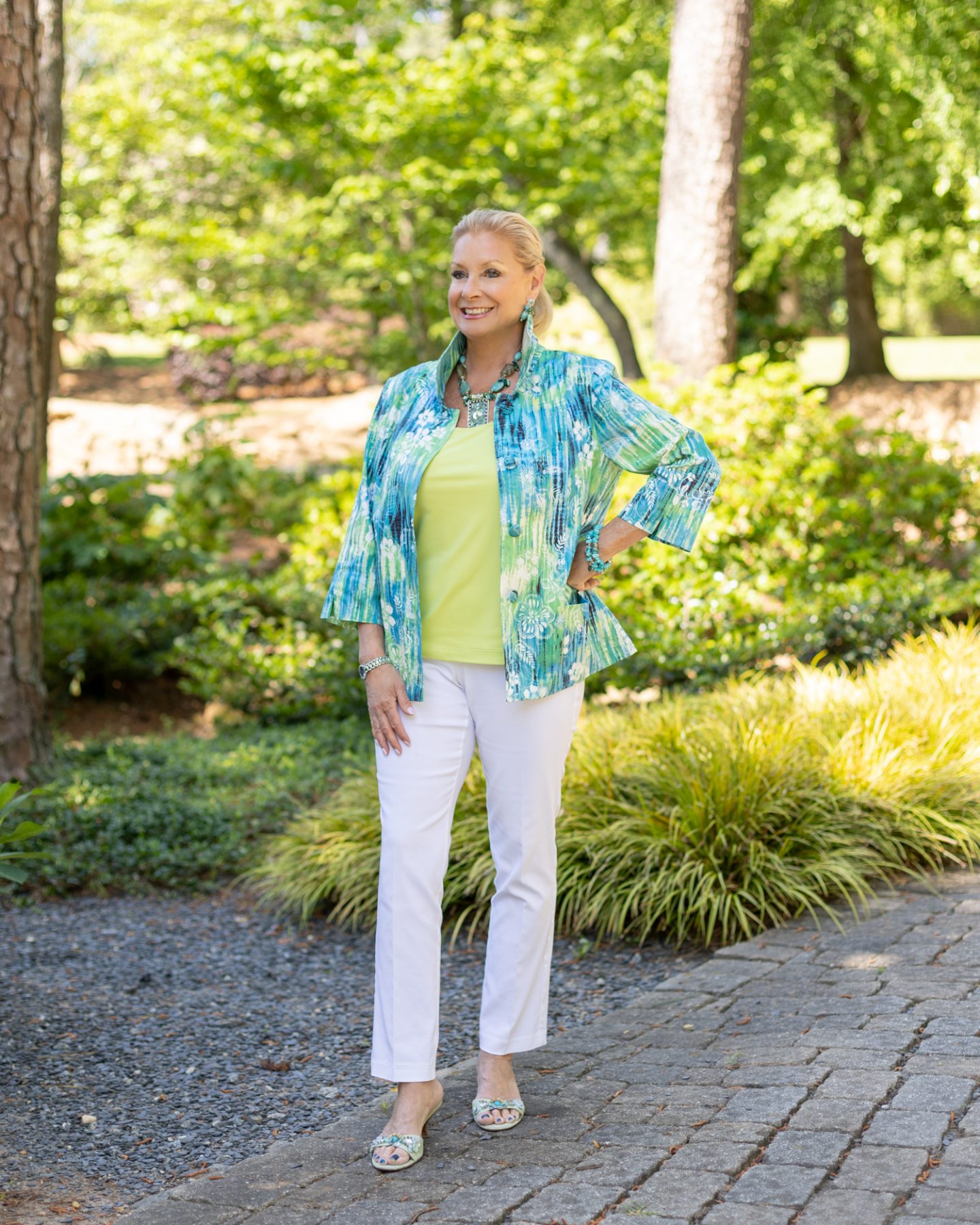 I am wearing a sleeveless tank top from my closet but I found a tank top and a short sleeve tee shirt that would also work from Draper’s & Damon’s for you. The Margarita green tee shirt is actually worn by the model on the online store.