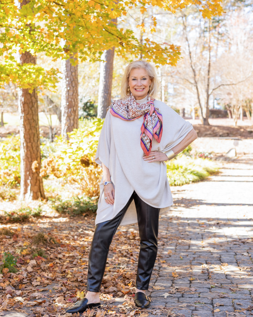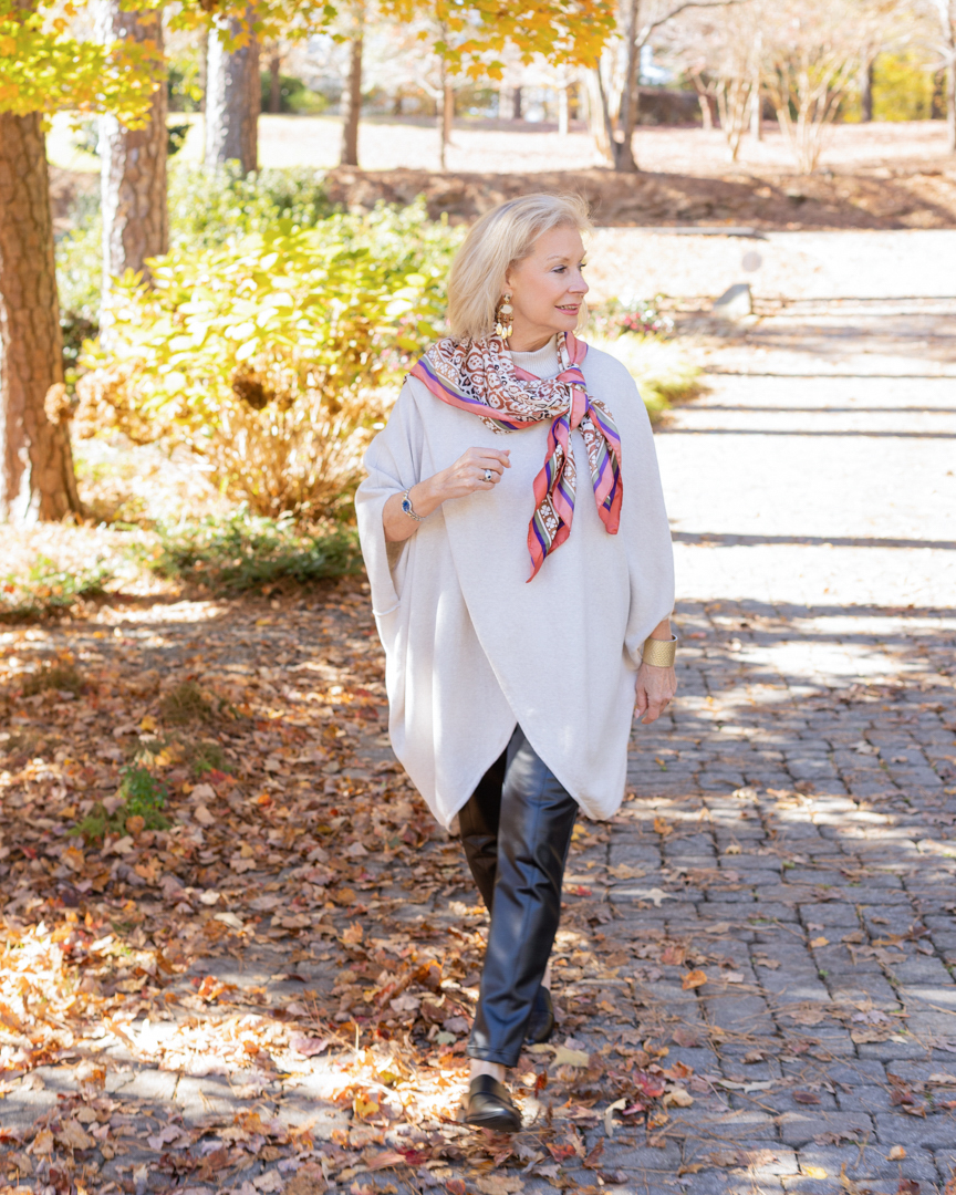 I am wearing faux leather pants from Peach with the poncho. I have had them since last year, and they are my favorite pants for colder weather! These pants are currently on sale, so I highly recommend you grab a pair! I love the stretch, and these pants look so great with so many tops!