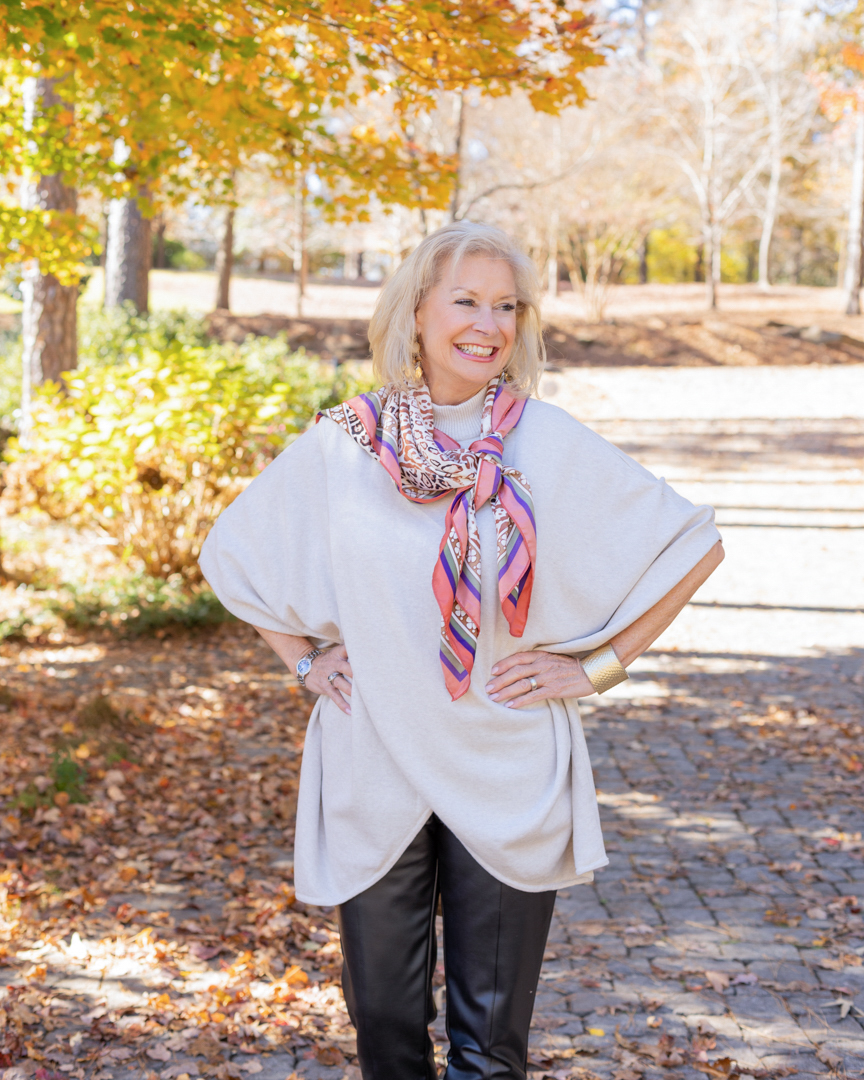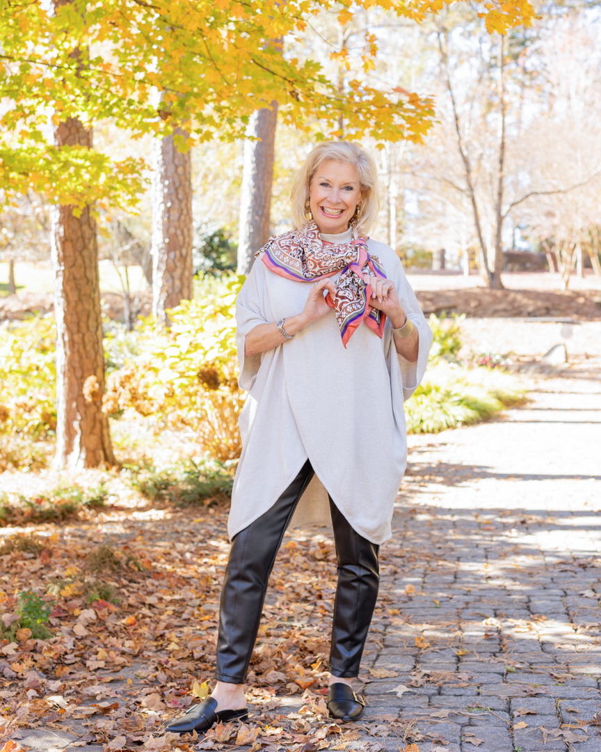 You can switch to your favorite holiday scarves for a more festive look! This silk print scarf is perfect for the fall season.