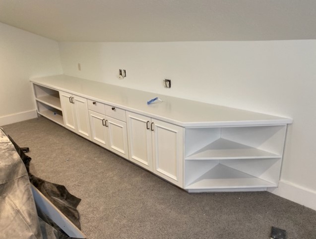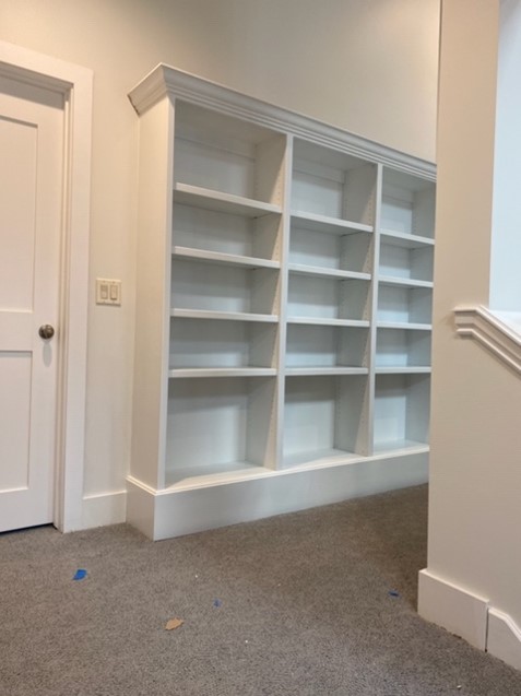 We kept the furniture but I rearranged it. Got rid of the massive television and now have a flat-screen on the bookcase. I had the contractor remove the upper section of the bookcase to accommodate the flat-screen television. All the cabinets were painted white.